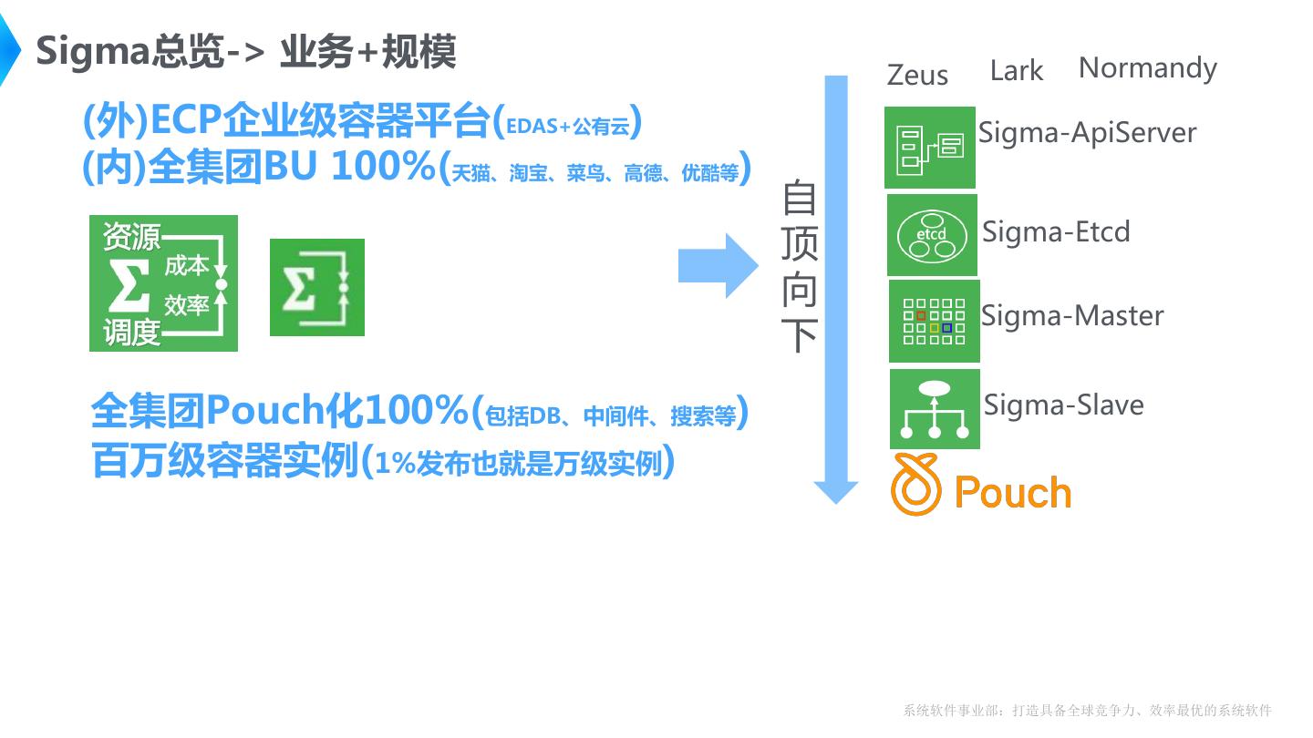3 .Sigma总览-> 业务+规模 Lark Normandy Zeus (外)ECP企业级容器平台(EDAS+公有云) Sigma-ApiServer (内)全集团BU 100%(天猫、淘宝、菜鸟、高德、优酷等) 自 Sigma-Etcd 顶 向 Sigma-Master 下 全集团Pouch化100%(包括DB、中间件、搜索等) Sigma-Slave 百万级容器实例(1%发布也就是万级实例) 系统软件事业部:打造具备全球竞争力、效率最优的系统软件