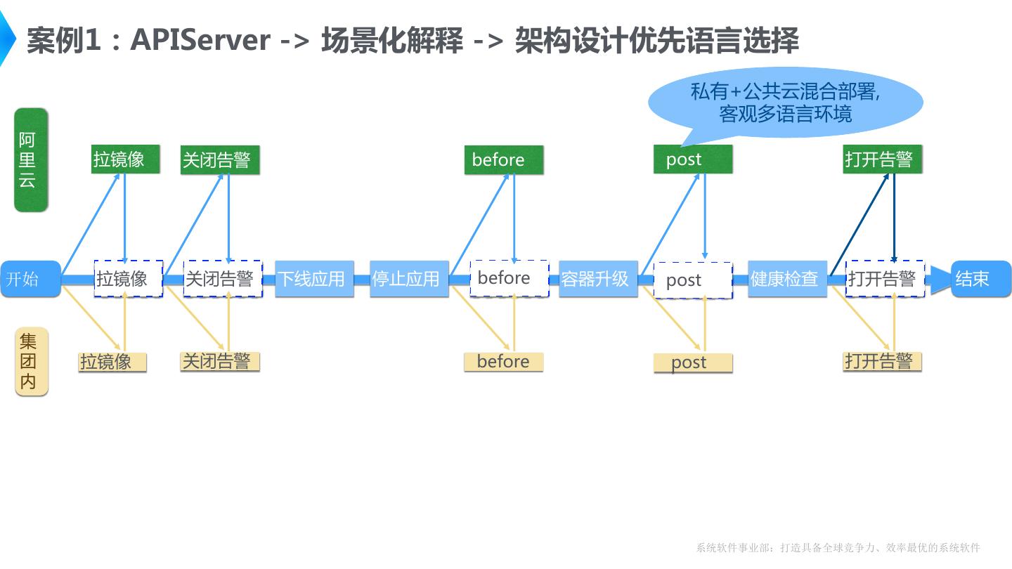 6 . 案例1:APIServer -> 场景化解释 -> 架构设计优先语言选择 私有+公共云混合部署, 客观多语言环境 阿 里 拉镜像 关闭告警 before post 打开告警 云 开始 拉镜像 关闭告警 下线应用 停止应用 before 容器升级 post 健康检查 打开告警 结束 集 团 拉镜像 关闭告警 before post 打开告警 内 系统软件事业部:打造具备全球竞争力、效率最优的系统软件