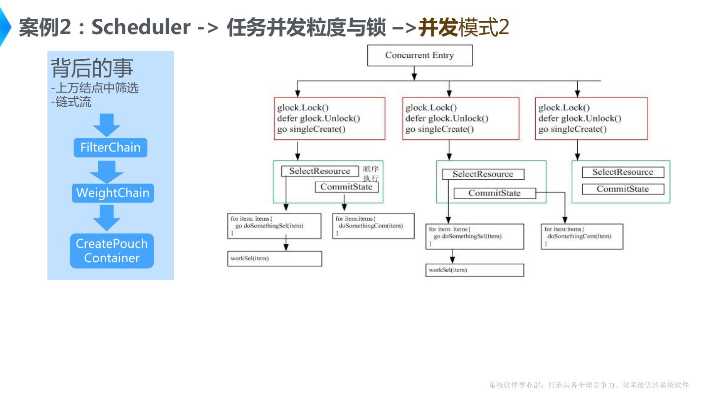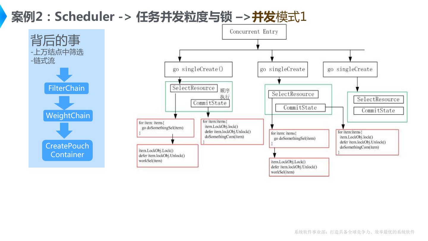 8 .案例2:Scheduler -> 任务并发粒度与锁 –>并发模式1 背后的事 -上万结点中筛选 -链式流 FilterChain WeightChain CreatePouch Container 系统软件事业部:打造具备全球竞争力、效率最优的系统软件