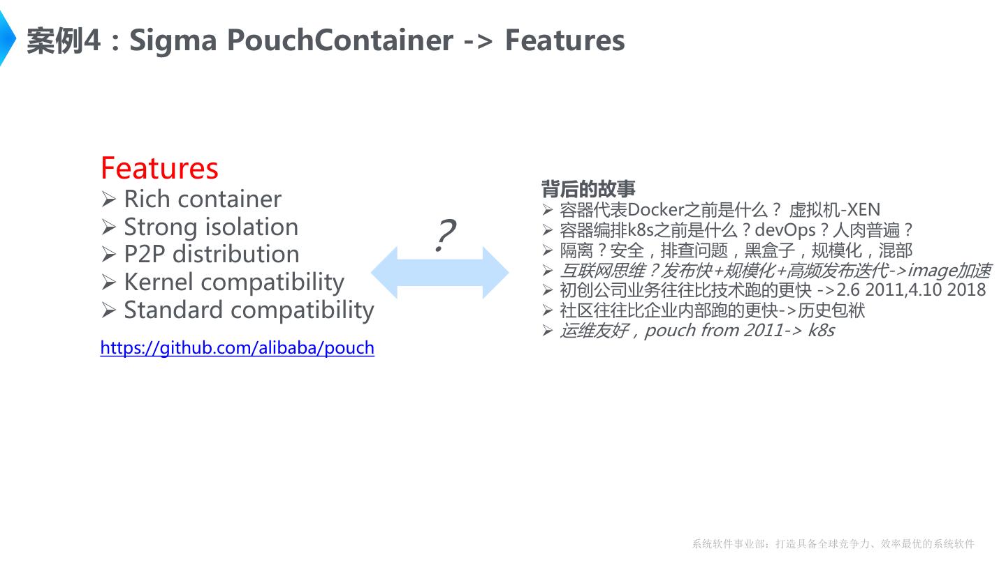 13 .案例4:Sigma PouchContainer -> Features Features 背后的故事 Rich container 容器代表Docker之前是什么? 虚拟机-XEN Strong isolation P2P distribution ? 容器编排k8s之前是什么?devOps?人肉普遍? 隔离?安全,排查问题,黑盒子,规模化,混部 互联网思维?发布快+规模化+高频发布迭代->image加速 Kernel compatibility 初创公司业务往往比技术跑的更快 ->2.6 2011,4.10 2018 Standard compatibility 社区往往比企业内部跑的更快->历史包袱 运维友好,pouch from 2011-> k8s https://github.com/alibaba/pouch 系统软件事业部:打造具备全球竞争力、效率最优的系统软件