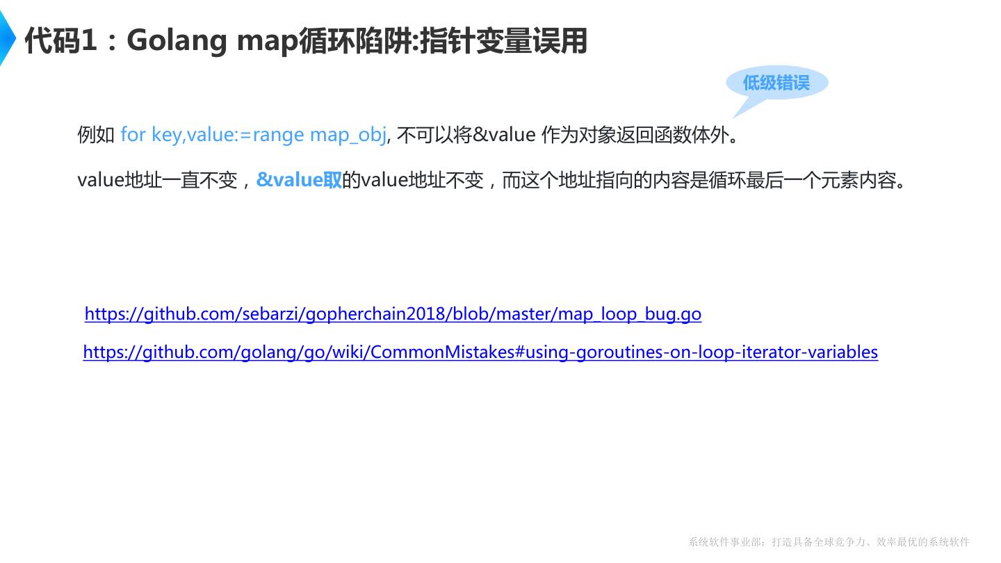 14 .代码1:Golang map循环陷阱:指针变量误用 低级错误 例如 for key,value:=range map_obj, 不可以将&value 作为对象返回函数体外。 value地址一直不变,&value取的value地址不变,而这个地址指向的内容是循环最后一个元素内容。 https://github.com/sebarzi/gopherchain2018/blob/master/map_loop_bug.go https://github.com/golang/go/wiki/CommonMistakes#using-goroutines-on-loop-iterator-variables 系统软件事业部:打造具备全球竞争力、效率最优的系统软件