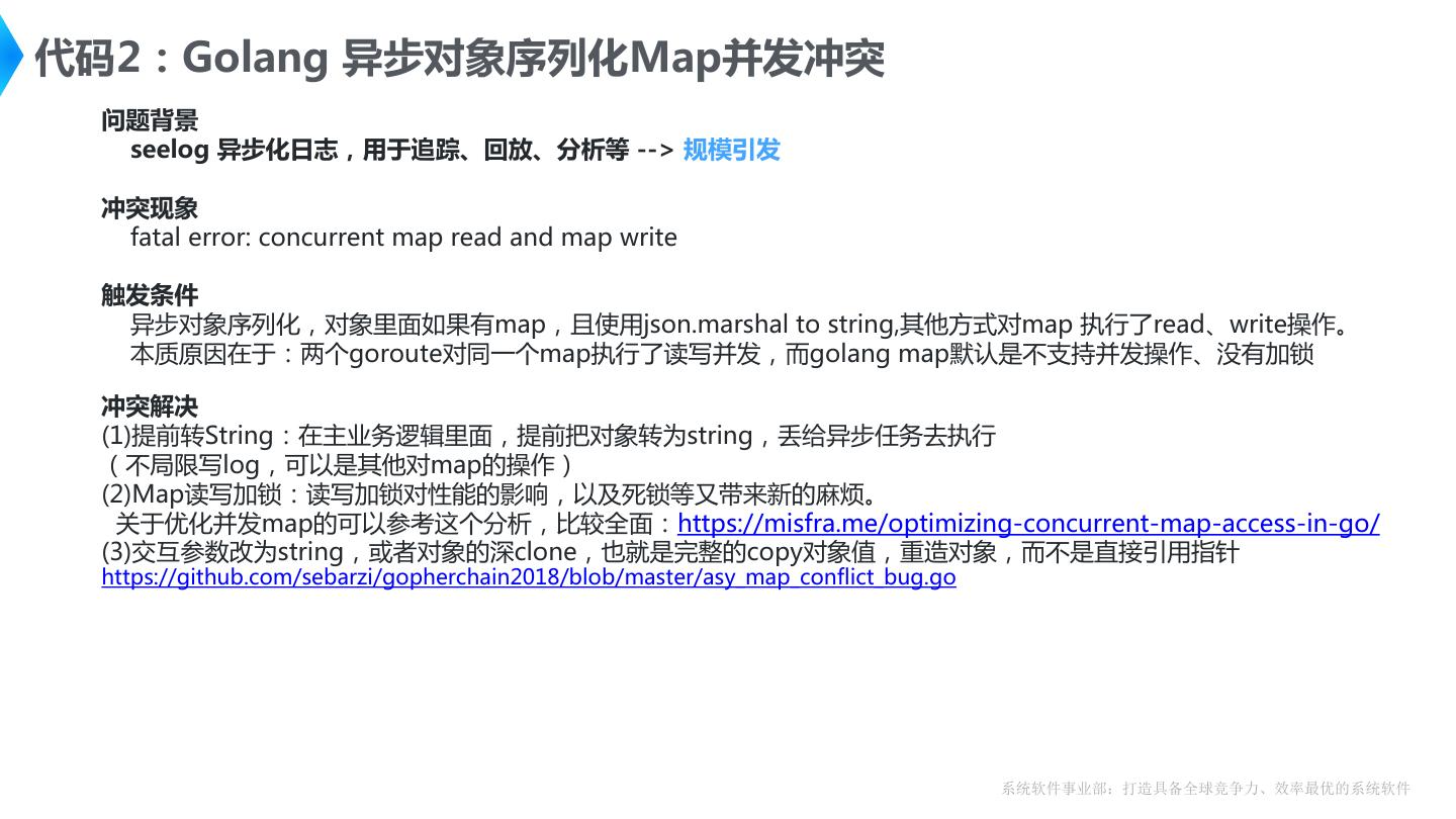 15 .代码2:Golang 异步对象序列化Map并发冲突 问题背景 seelog 异步化日志,用于追踪、回放、分析等 --> 规模引发 冲突现象 fatal error: concurrent map read and map write 触发条件 异步对象序列化,对象里面如果有map,且使用json.marshal to string,其他方式对map 执行了read、write操作。 本质原因在于:两个goroute对同一个map执行了读写并发,而golang map默认是不支持并发操作、没有加锁 冲突解决 (1)提前转String:在主业务逻辑里面,提前把对象转为string,丢给异步任务去执行 (不局限写log,可以是其他对map的操作) (2)Map读写加锁:读写加锁对性能的影响,以及死锁等又带来新的麻烦。 关于优化并发map的可以参考这个分析,比较全面:https://misfra.me/optimizing-concurrent-map-access-in-go/ (3)交互参数改为string,或者对象的深clone,也就是完整的copy对象值,重造对象,而不是直接引用指针 https://github.com/sebarzi/gopherchain2018/blob/master/asy_map_conflict_bug.go 系统软件事业部:打造具备全球竞争力、效率最优的系统软件