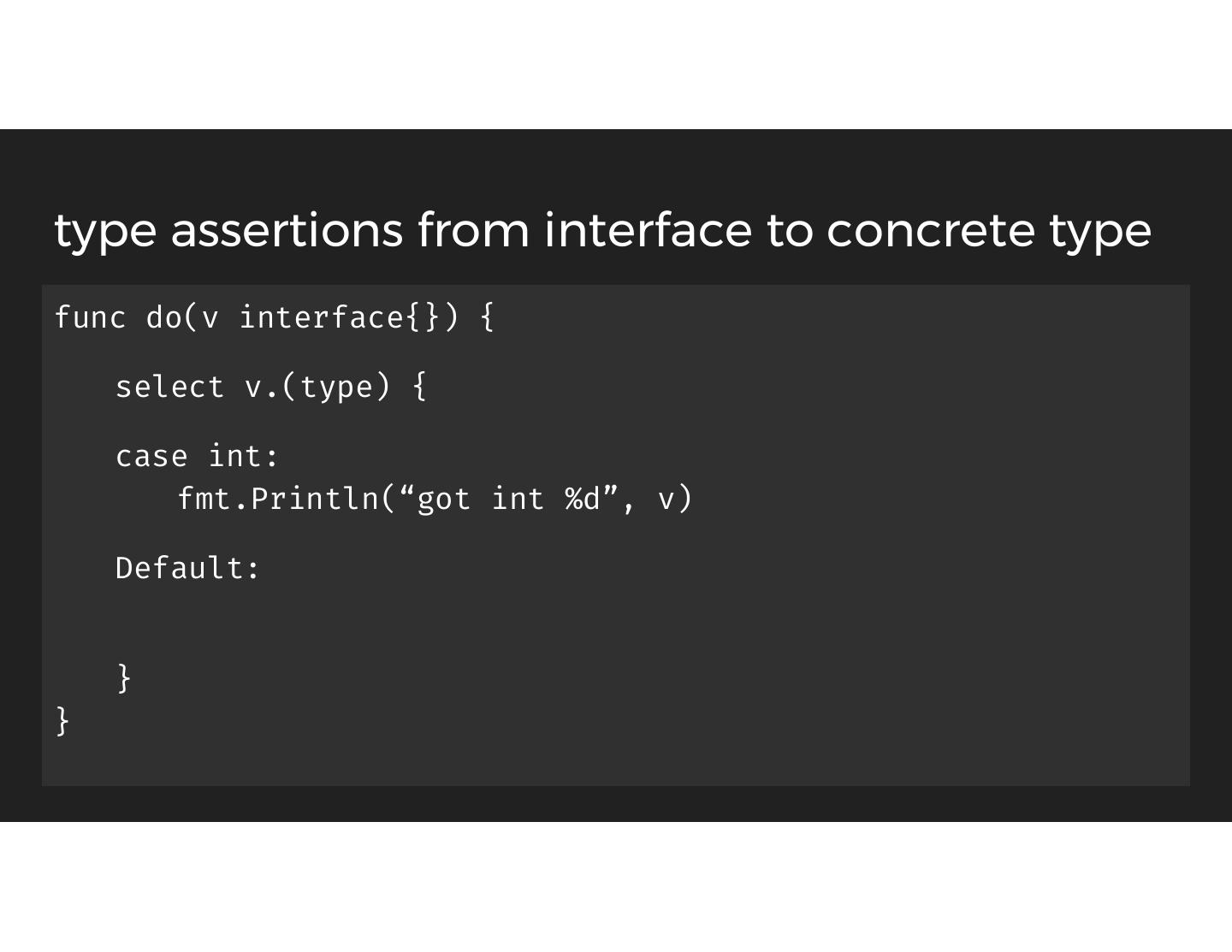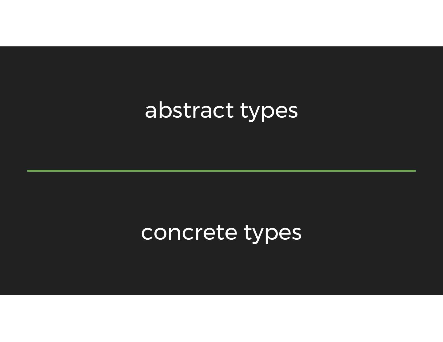 11 .concrete types in Go - they describe a memory layout int8 int16 int32 int64 - behavior attached to data through methods