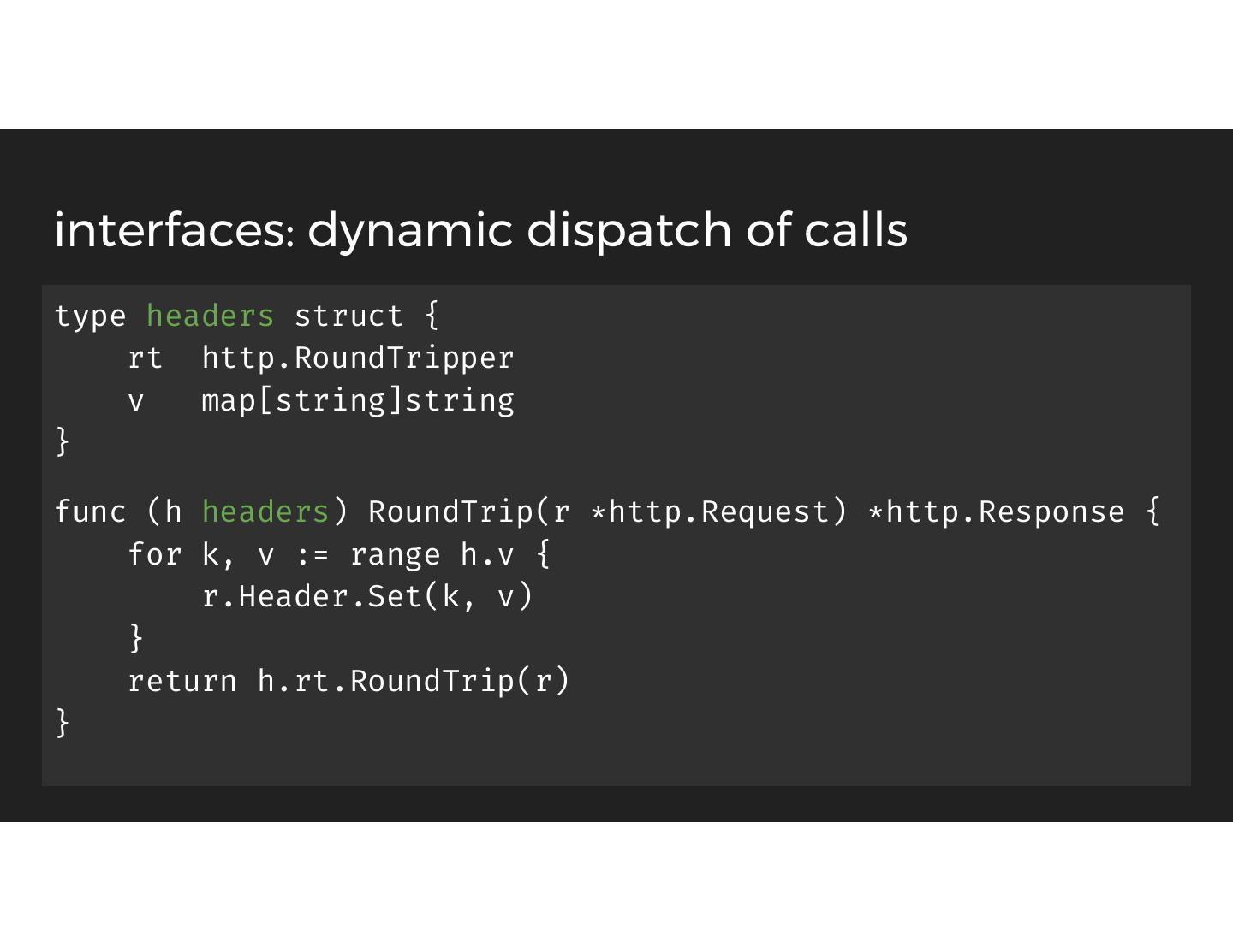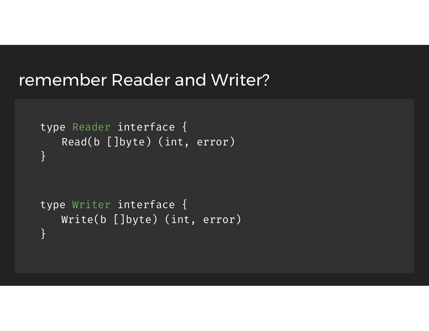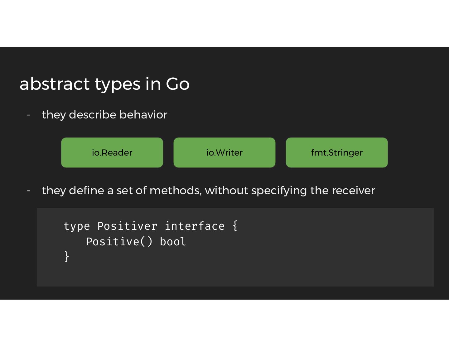 13 .abstract types in Go - they describe behavior io.Reader io.Writer fmt.Stringer - they define a set of methods, without specifying the receiver