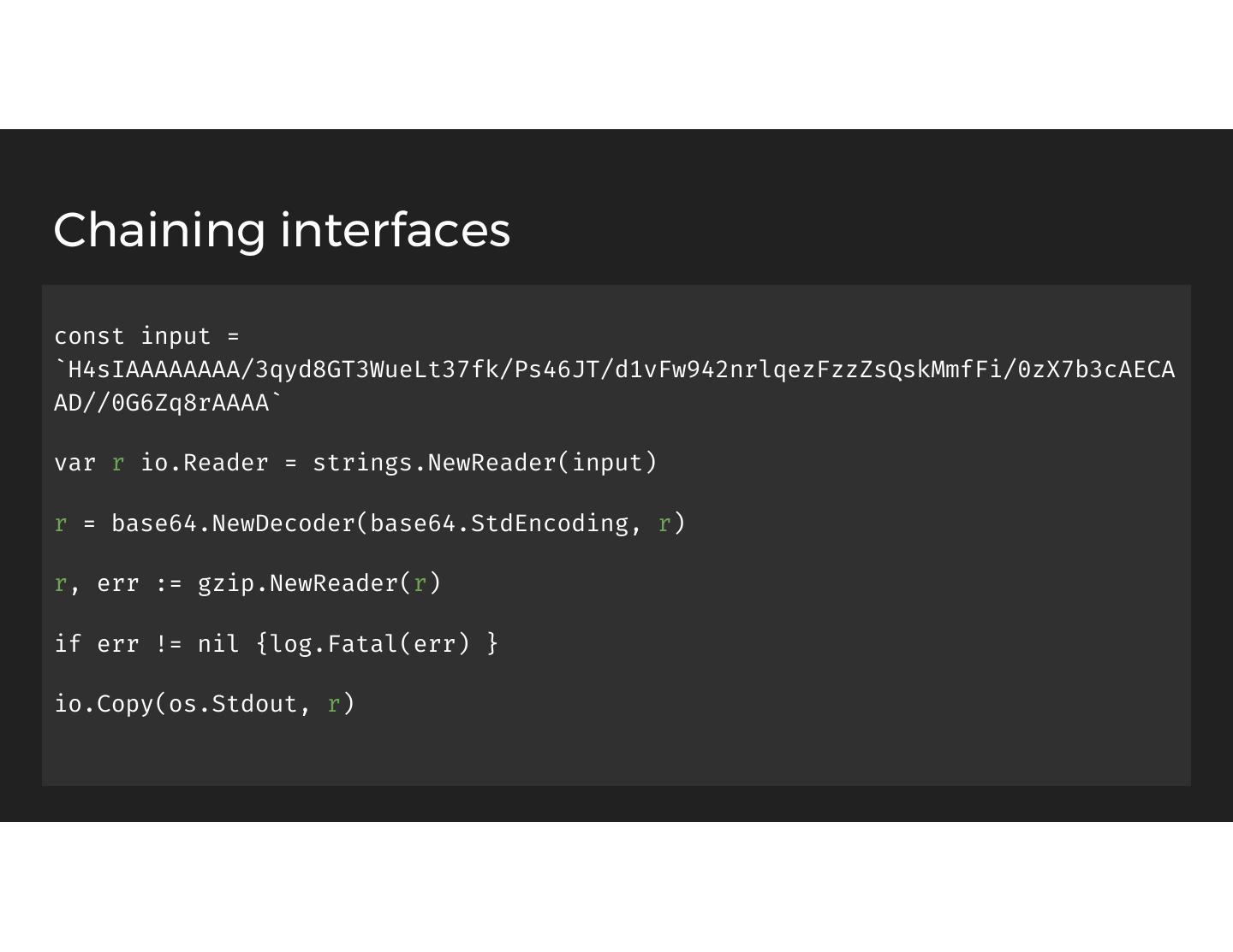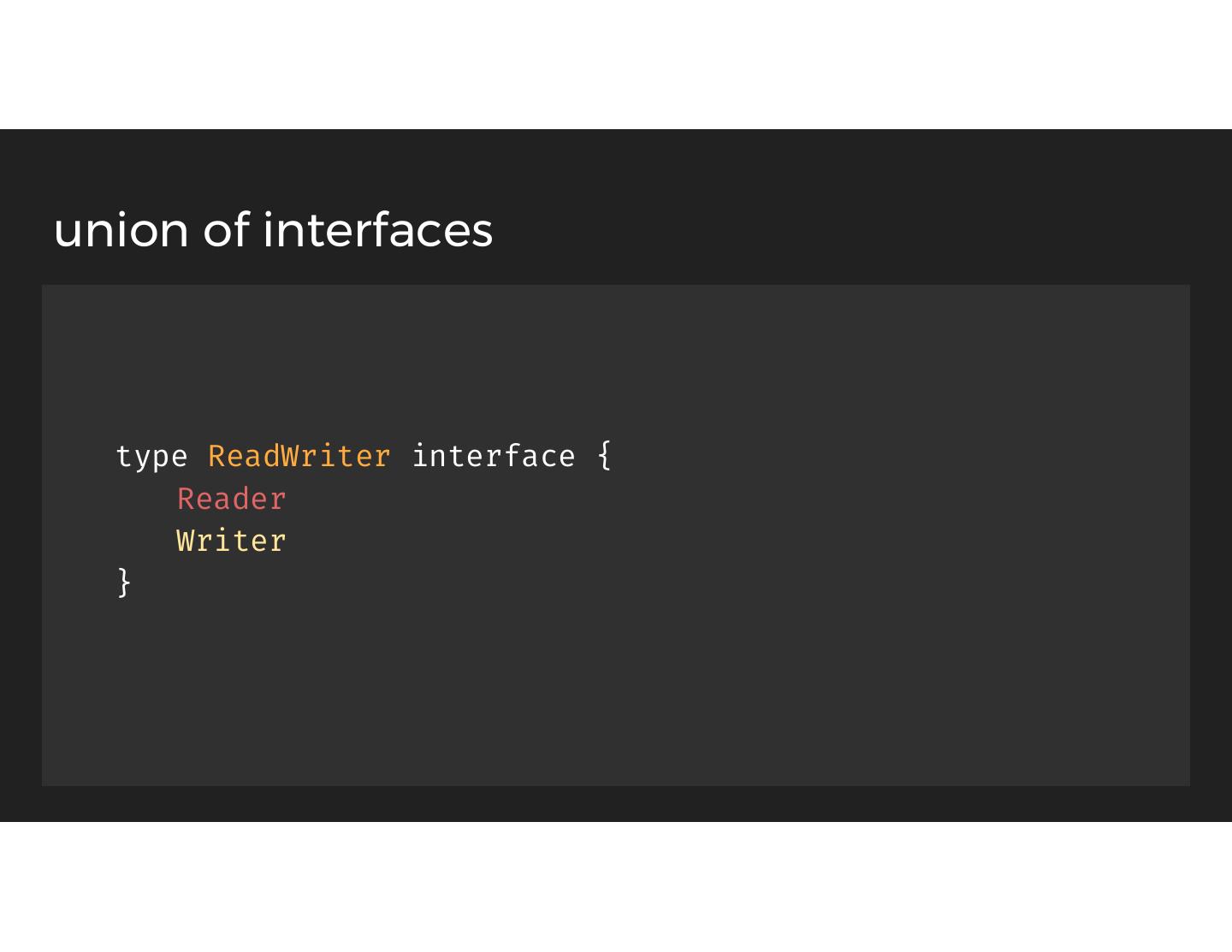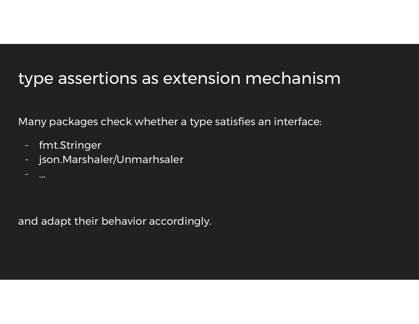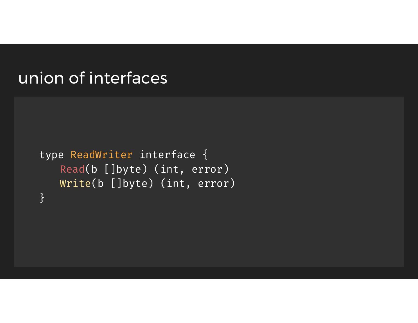 13 .abstract types in Go - they describe behavior io.Reader io.Writer fmt.Stringer - they define a set of methods, without specifying the receiver