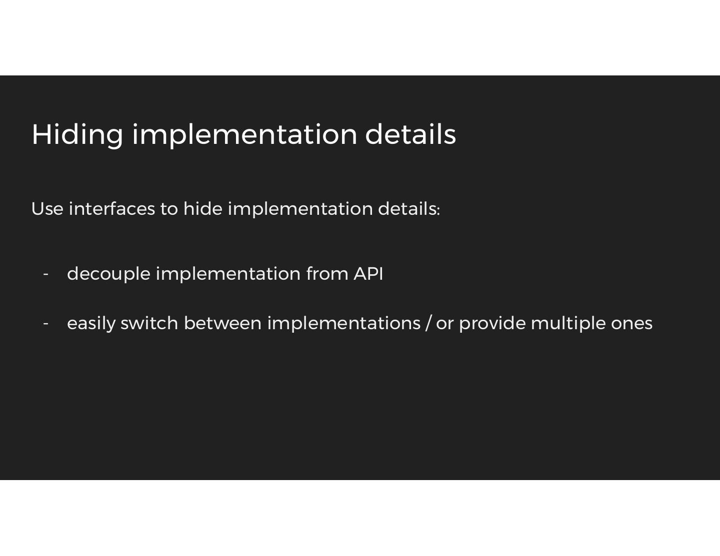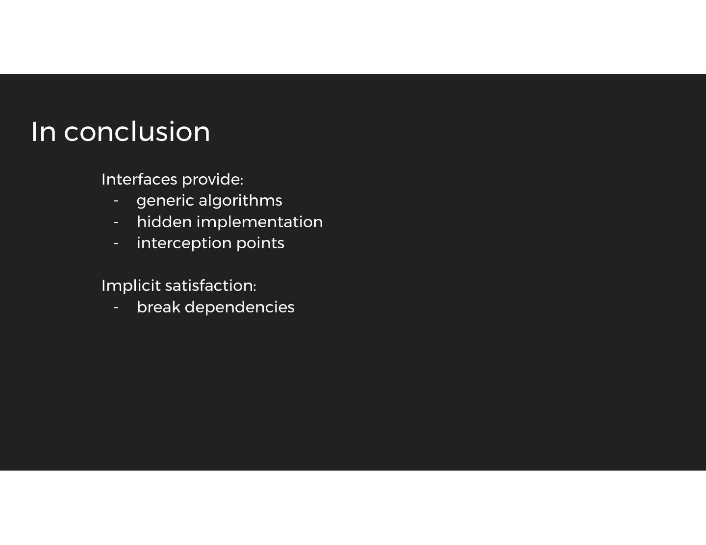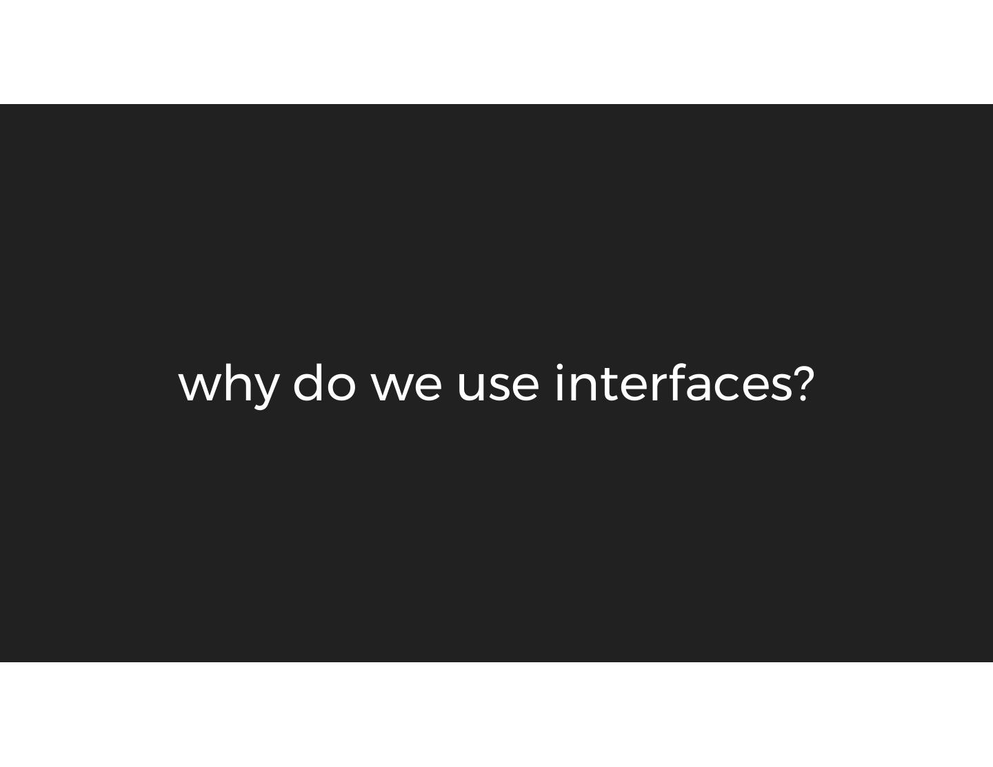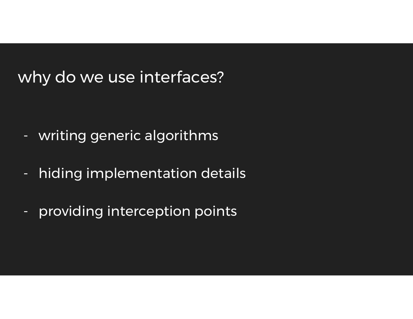 24 .why do we use interfaces? - writing generic algorithms - hiding implementation details - providing interception points