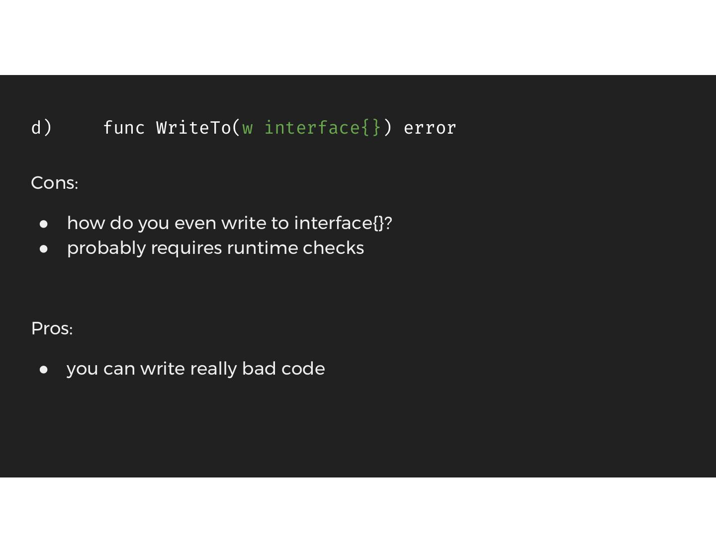 27 .Cons: how do you even write to interface{}? probably requires runtime checks Pros: you can write really bad code