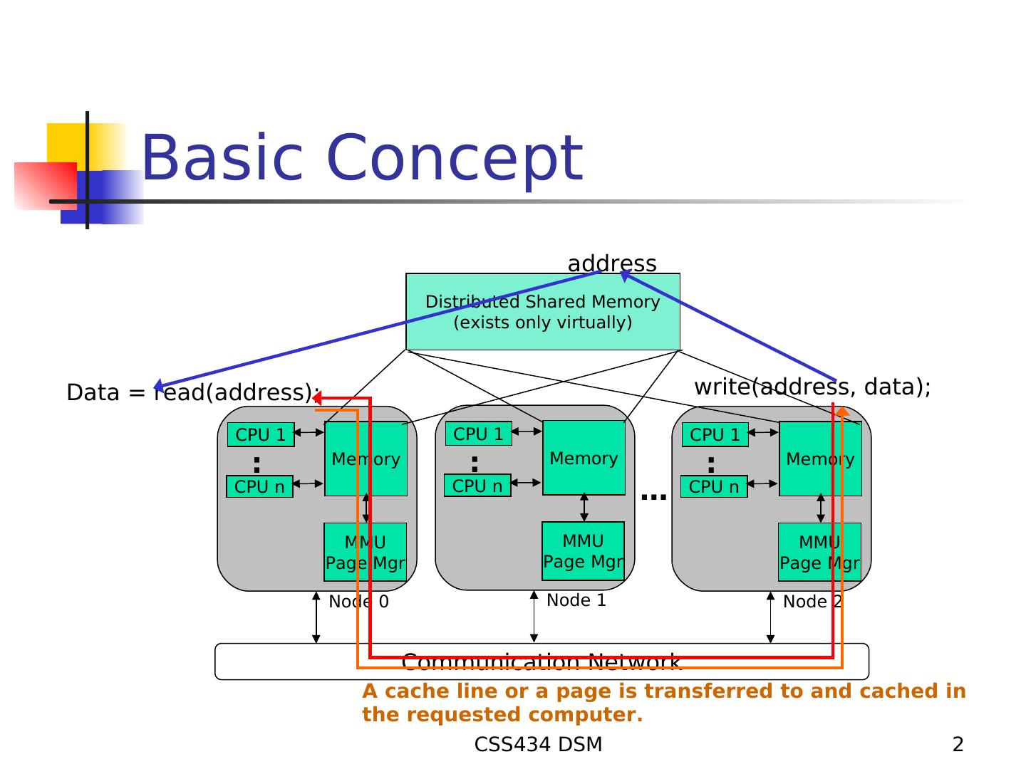2 . Basic Concept address Distributed Shared Memory (exists only virtually) Data = read(address); write(address, data); CPU 1 CPU 1 CPU 1 : Memory : Memory : Memory CPU n CPU n … CPU n MMU MMU MMU Page Mgr Page Mgr Page Mgr Node 0 Node 1 Node 2 Communication Network A cache line or a page is transferred to and cached in the requested computer. CSS434 DSM 2