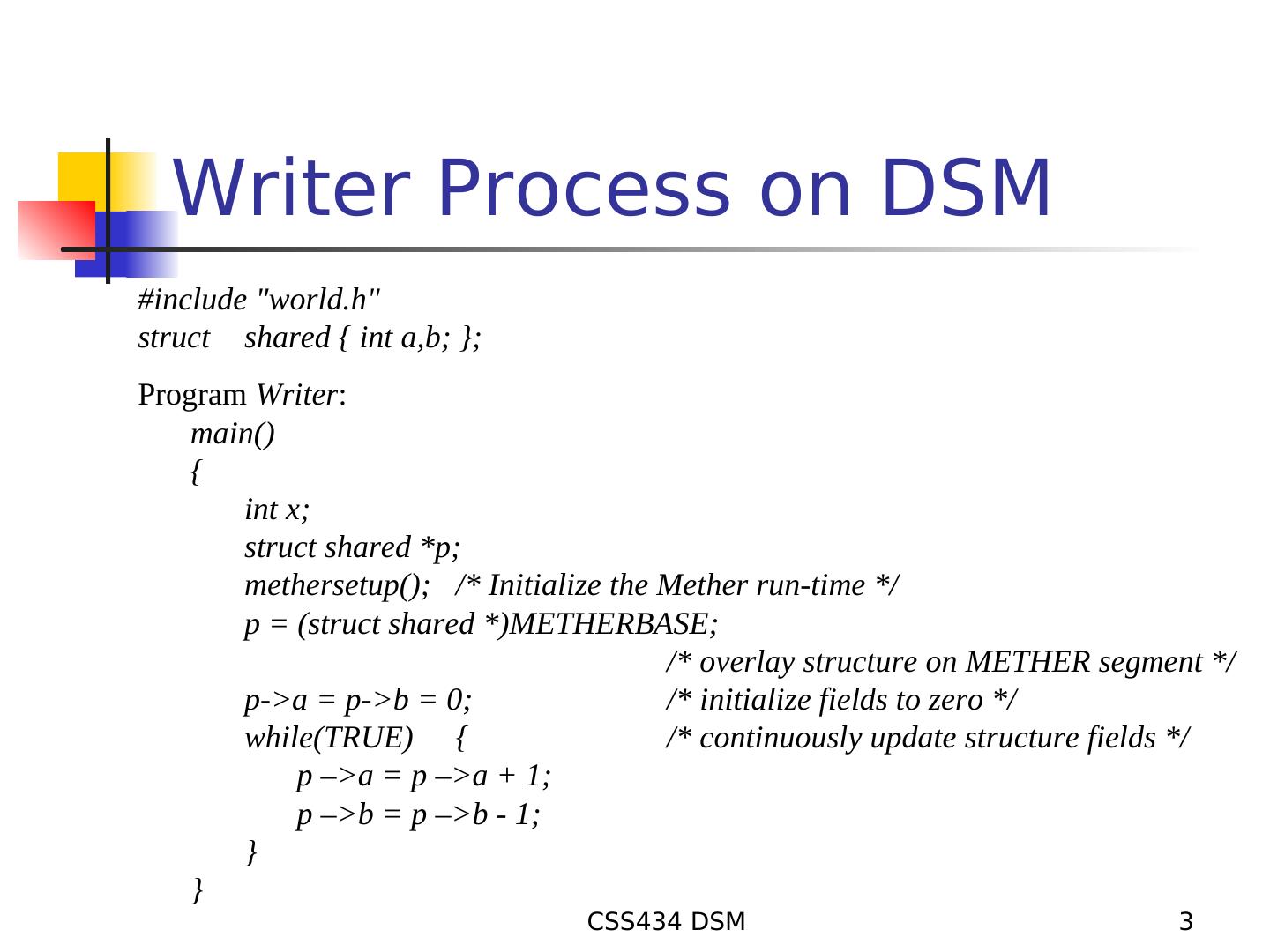 3 . Writer Process on DSM #include "world.h" struct shared { int a,b; }; Program Writer: main() { int x; struct shared *p; methersetup(); /* Initialize the Mether run-time */ p = (struct shared *)METHERBASE; /* overlay structure on METHER segment */ p->a = p->b = 0; /* initialize fields to zero */ while(TRUE) { /* continuously update structure fields */ p –>a = p –>a + 1; p –>b = p –>b - 1; } } CSS434 DSM 3