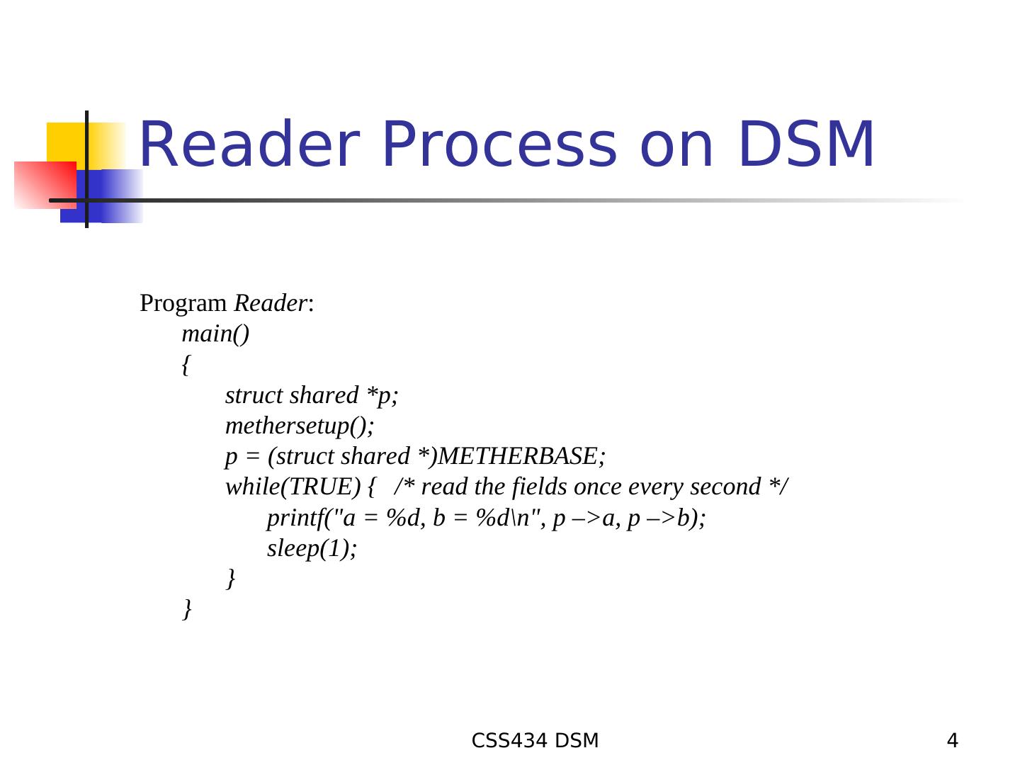 4 .Reader Process on DSM Program Reader: main() { struct shared *p; methersetup(); p = (struct shared *)METHERBASE; while(TRUE) { /* read the fields once every second */ printf("a = %d, b = %d\n", p –>a, p –>b); sleep(1); } } CSS434 DSM 4
