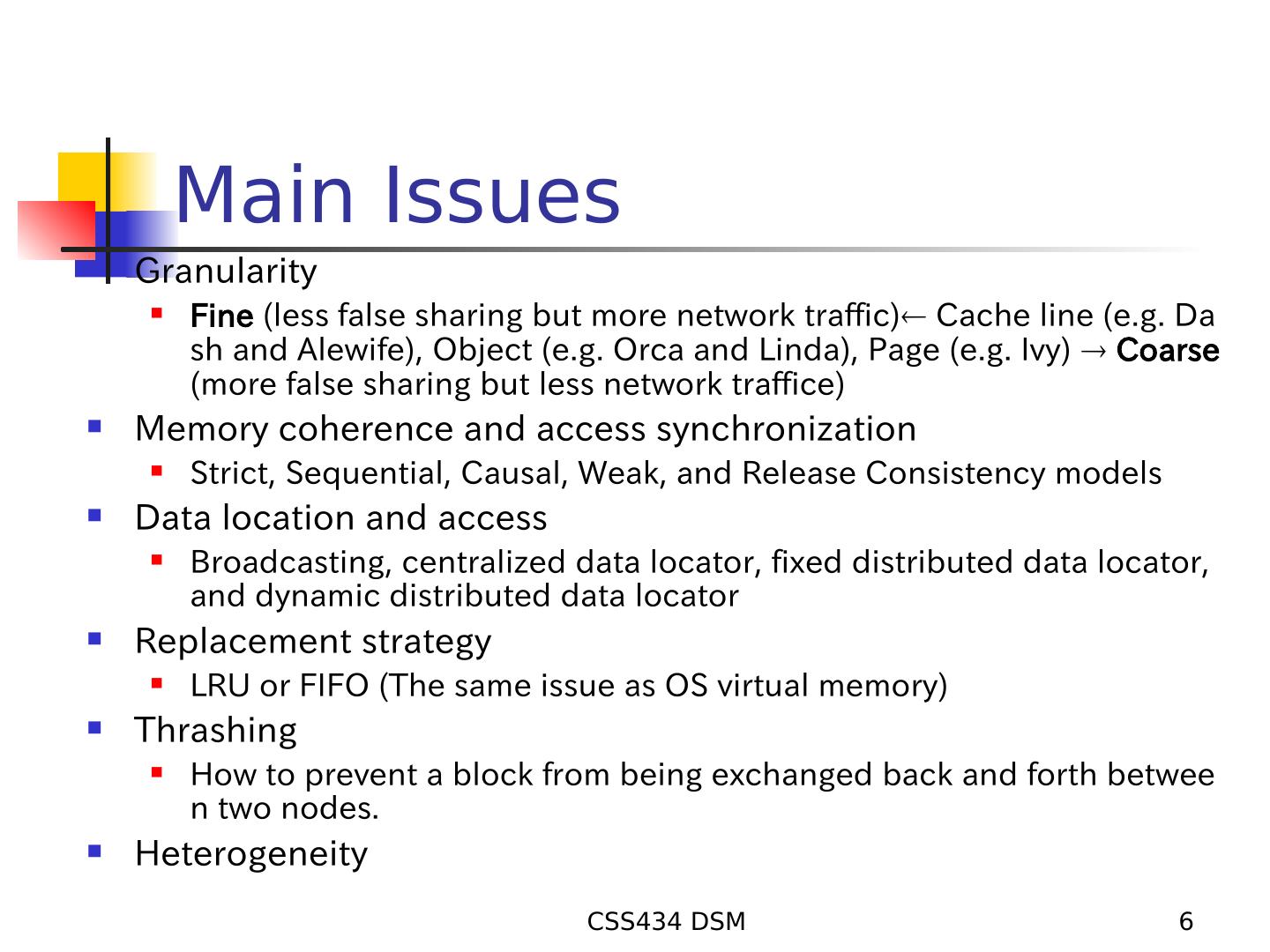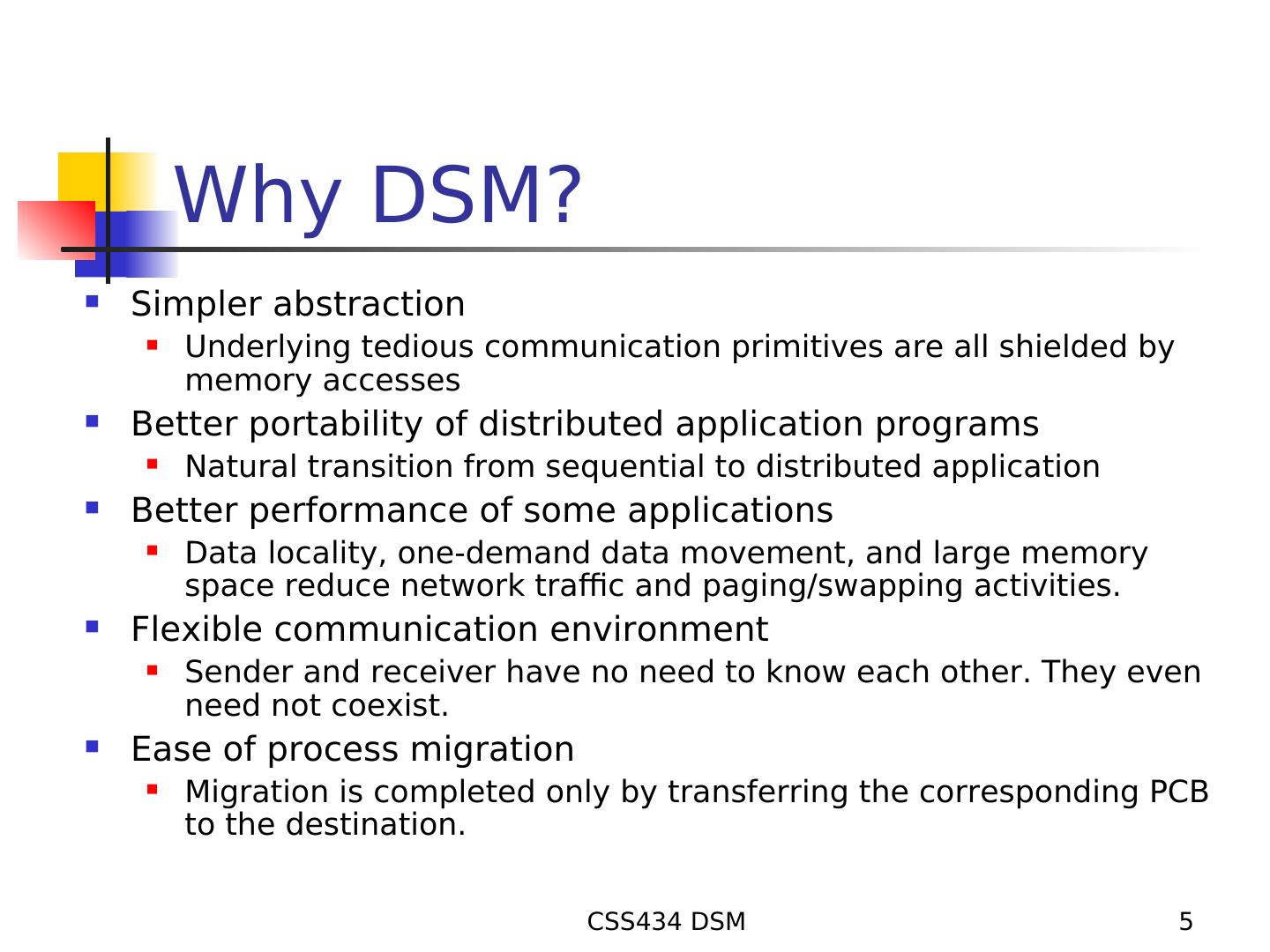 5 . Why DSM? Simpler abstraction Underlying tedious communication primitives are all shielded by memory accesses Better portability of distributed application programs Natural transition from sequential to distributed application Better performance of some applications Data locality, one-demand data movement, and large memory space reduce network traffic and paging/swapping activities. Flexible communication environment Sender and receiver have no need to know each other. They even need not coexist. Ease of process migration Migration is completed only by transferring the corresponding PCB to the destination. CSS434 DSM 5
