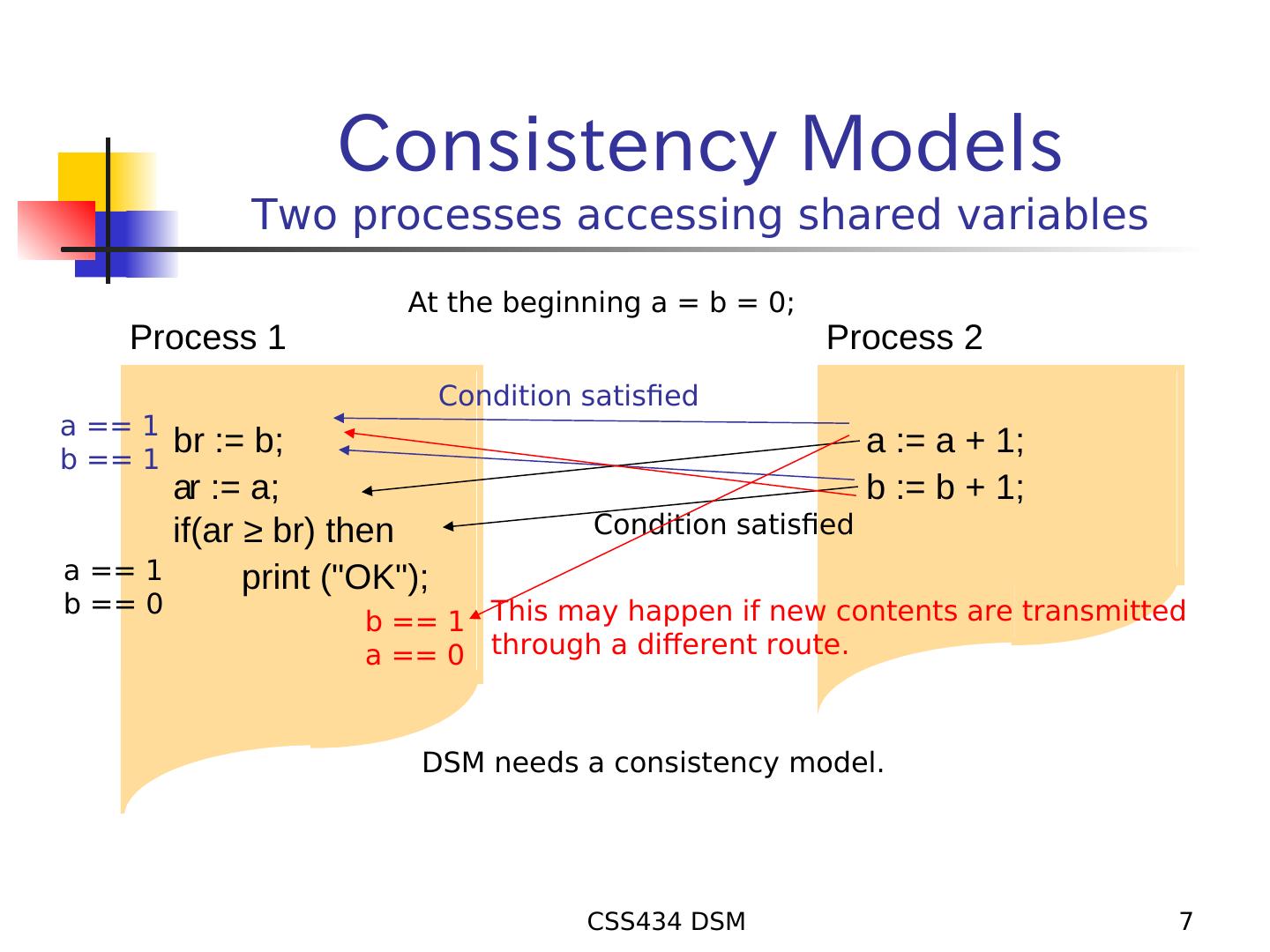 7 . Consistency Models Two processes accessing shared variables At the beginning a = b = 0; Process 1 Process 2 Condition satisfied a == 1 b == 1 br := b; a := a + 1; ar := a; b := b + 1; if(ar ≥ br) then Condition satisfied a == 1 print ("OK"); b == 0 b == 1 This may happen if new contents are transmitted a == 0 through a different route. DSM needs a consistency model. CSS434 DSM 7