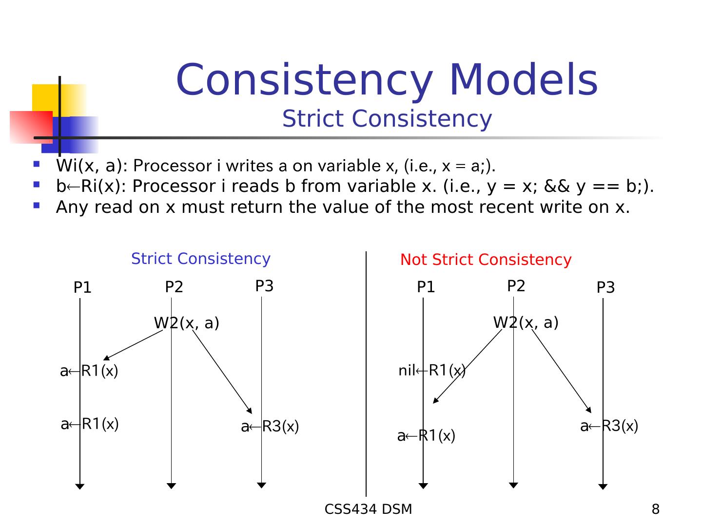 8 . Consistency Models Strict Consistency Wi(x, a): Processor i writes a on variable x, (i.e., x = a;). bRi(x): Processor i reads b from variable x. (i.e., y = x; && y == b;). Any read on x must return the value of the most recent write on x. Strict Consistency Not Strict Consistency P1 P2 P3 P1 P2 P3 W2(x, a) W2(x, a) aR1(x) nilR1(x) aR1(x) aR3(x) aR3(x) aR1(x) CSS434 DSM 8