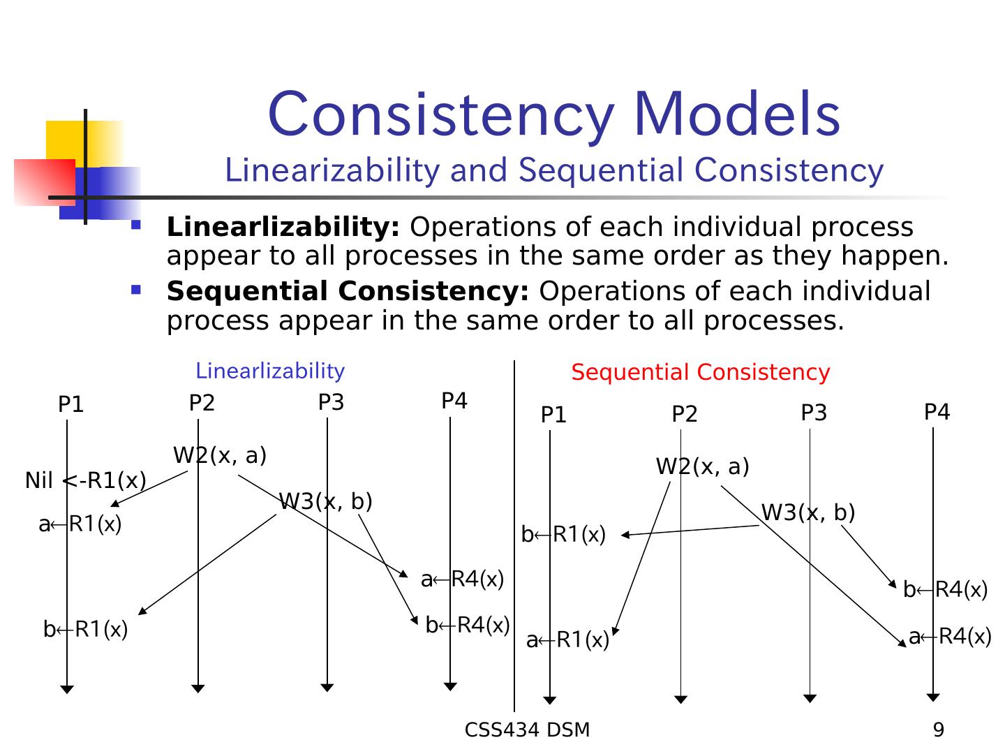 9 . Consistency Models Linearizability and Sequential Consistency Linearlizability: Operations of each individual process appear to all processes in the same order as they happen. Sequential Consistency: Operations of each individual process appear in the same order to all processes. Linearlizability Sequential Consistency P1 P2 P3 P4 P4 P1 P2 P3 W2(x, a) W2(x, a) Nil <-R1(x) W3(x, b) W3(x, b) aR1(x) bR1(x) aR4(x) bR4(x) bR1(x) bR4(x) aR4(x) aR1(x) CSS434 DSM 9