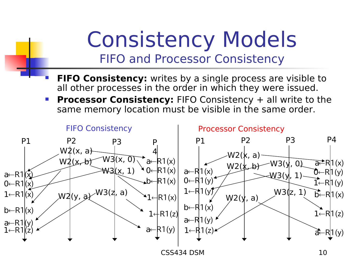 10 . Consistency Models FIFO and Processor Consistency FIFO Consistency: writes by a single process are visible to all other processes in the order in which they were issued. Processor Consistency: FIFO Consistency + all write to the same memory location must be visible in the same order. FIFO Consistency Processor Consistency P1 P2 P3 P P1 P2 P3 P4 W2(x, a) 4 W2(x, a) W2(x, b) W3(x, 0) aR1(x) aR1(x) W2(x, b) W3(y, 0) W3(x, 1) 0R1(x) aR1(x) 0R1(y) aR1(x) W3(y, 1) 0R1(x) bR1(x) 0R1(y) 1R1(y) 1R1(y) W3(z, 1) 1R1(x) W2(y, a) W3(z, a) 1R1(x) W2(y, a) bR1(x) bR1(x) bR1(x) 1R1(z) 1R1(z) aR1(y) aR1(y) 1R1(z) aR1(y) 1R1(z) aR1(y) CSS434 DSM 10