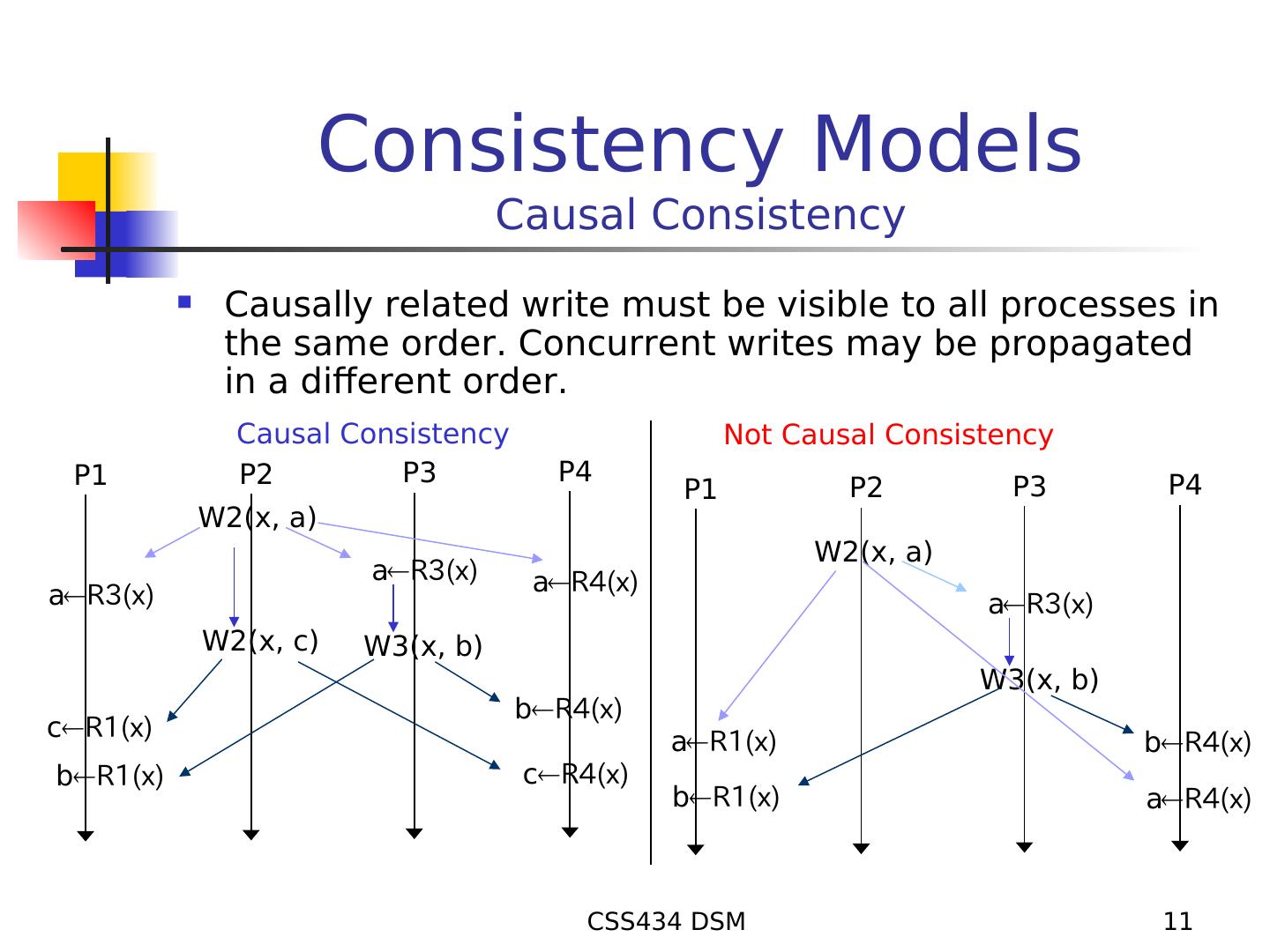 11 . Consistency Models Causal Consistency Causally related write must be visible to all processes in the same order. Concurrent writes may be propagated in a different order. Causal Consistency Not Causal Consistency P1 P2 P3 P4 P4 P1 P2 P3 W2(x, a) W2(x, a) aR3(x) aR4(x) aR3(x) aR3(x) W2(x, c) W3(x, b) W3(x, b) bR4(x) cR1(x) aR1(x) bR4(x) bR1(x) cR4(x) bR1(x) aR4(x) CSS434 DSM 11