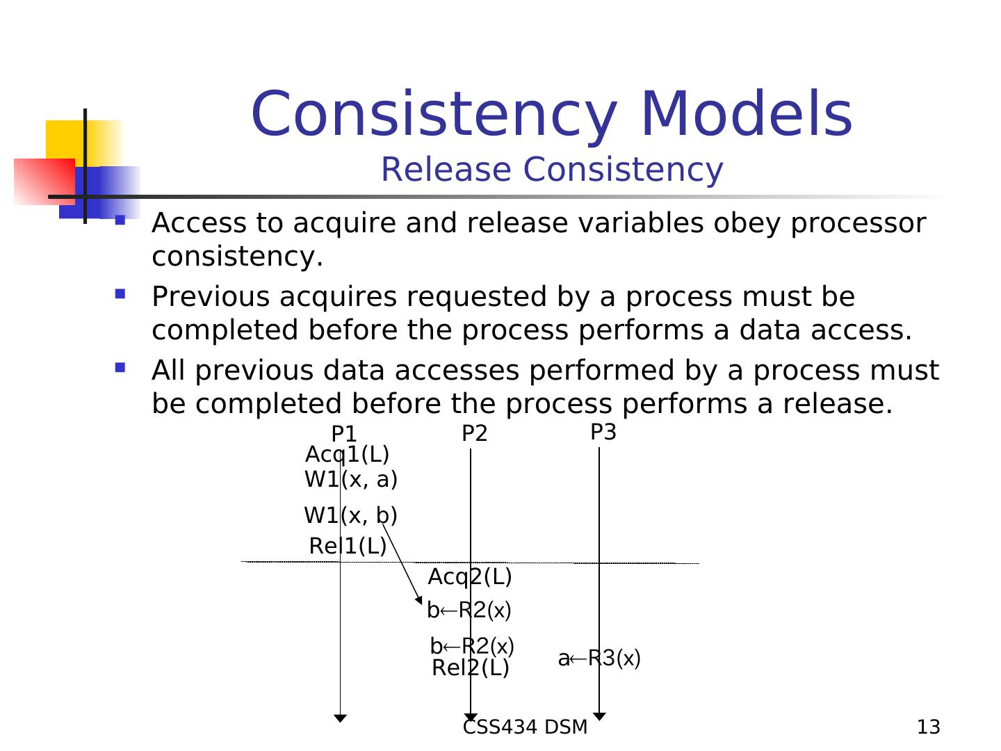 12 . Consistency Models Weak Consistency Accesses to synchronization variables must obey sequential consistency. All previous writes must be completed before an access to a synchronization variable. All previous accesses to synchronization variables must be completed before access to non-synchronization variable. Weak Consistency Not Weak Consistency P1 P2 P3 P1 P2 P3 W2(x, a) W2(x, a) W2(x, b) W2(y, c) bR4(x) W2(y, c) aR4(x) W2(x, b) NilR4(y) S3 S3 S1 S1 S2 S2 cR4(y) bR4(x) bR4(x) aR4(x) cR4(y) cR4(y) cR4(y) bR4(x) CSS434 DSM 12