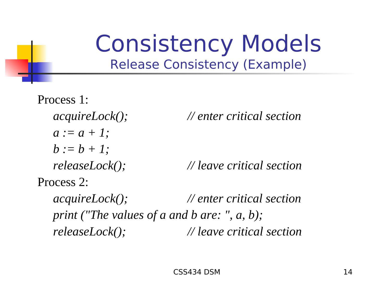 14 . Consistency Models Release Consistency (Example) Process 1: acquireLock(); // enter critical section a := a + 1; b := b + 1; releaseLock(); // leave critical section Process 2: acquireLock(); // enter critical section print ("The values of a and b are: ", a, b); releaseLock(); // leave critical section CSS434 DSM 14