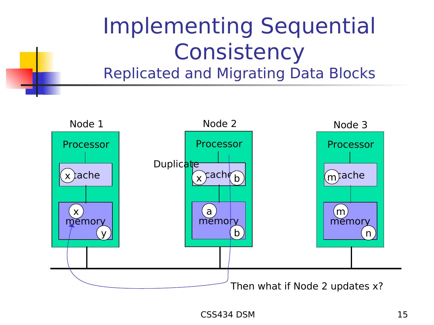 15 . Implementing Sequential Consistency Replicated and Migrating Data Blocks Node 1 Node 2 Node 3 Processor Processor Processor Duplicate x cache x cache b mcache x a m memory memory memory y b n Then what if Node 2 updates x? CSS434 DSM 15