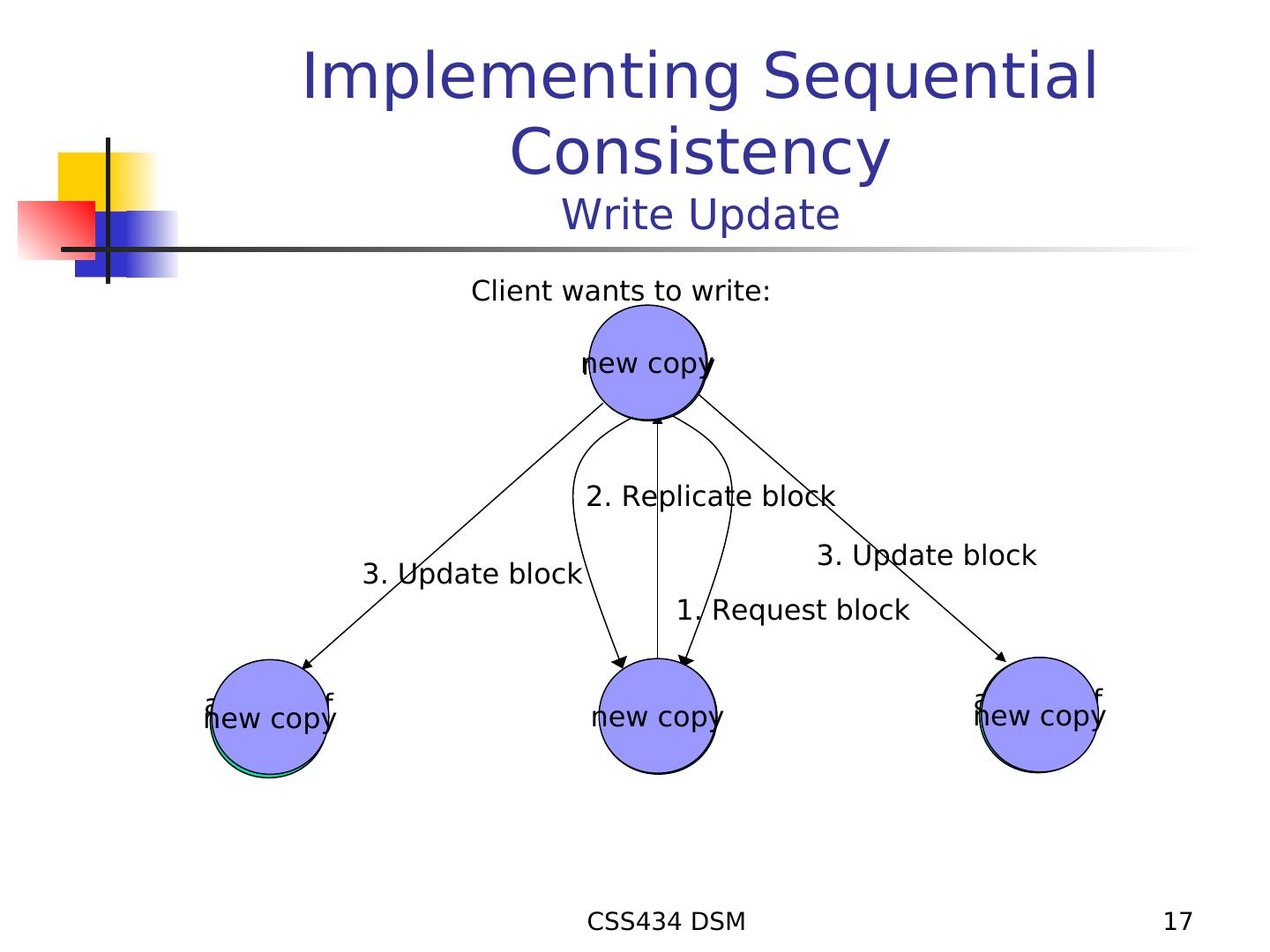17 . Implementing Sequential Consistency Write Update Client wants to write: new copy 2. Replicate block 3. Update block 3. Update block 1. Request block a copy of a copy of new copy new copy block new copy block block CSS434 DSM 17