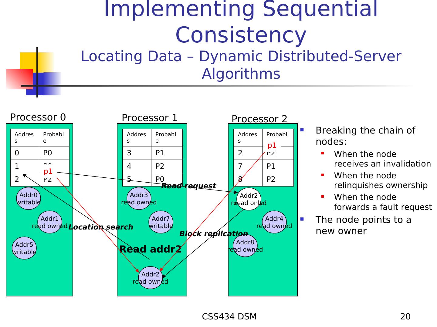 19 . Implementing Sequential Consistency Locating Data –Fixed Distributed-Server Algorithms Processor 0 Processor 1 Processor 2 Addres Owne Addres Owne Addres Owne s r s r s r 0 P0 3 P1 6 P2 1 P0 4 P2 7 P1 2 P2 5 P0 8 P2 Read request Addr0 Addr3 Addr2 writable read owned read owned Addr1 Addr7 Addr4 read owned Location search writable read owned Block replication Addr5 Addr6 writable Read addr2 writable Addr2 Addr8 read only read owned CSS434 DSM 19