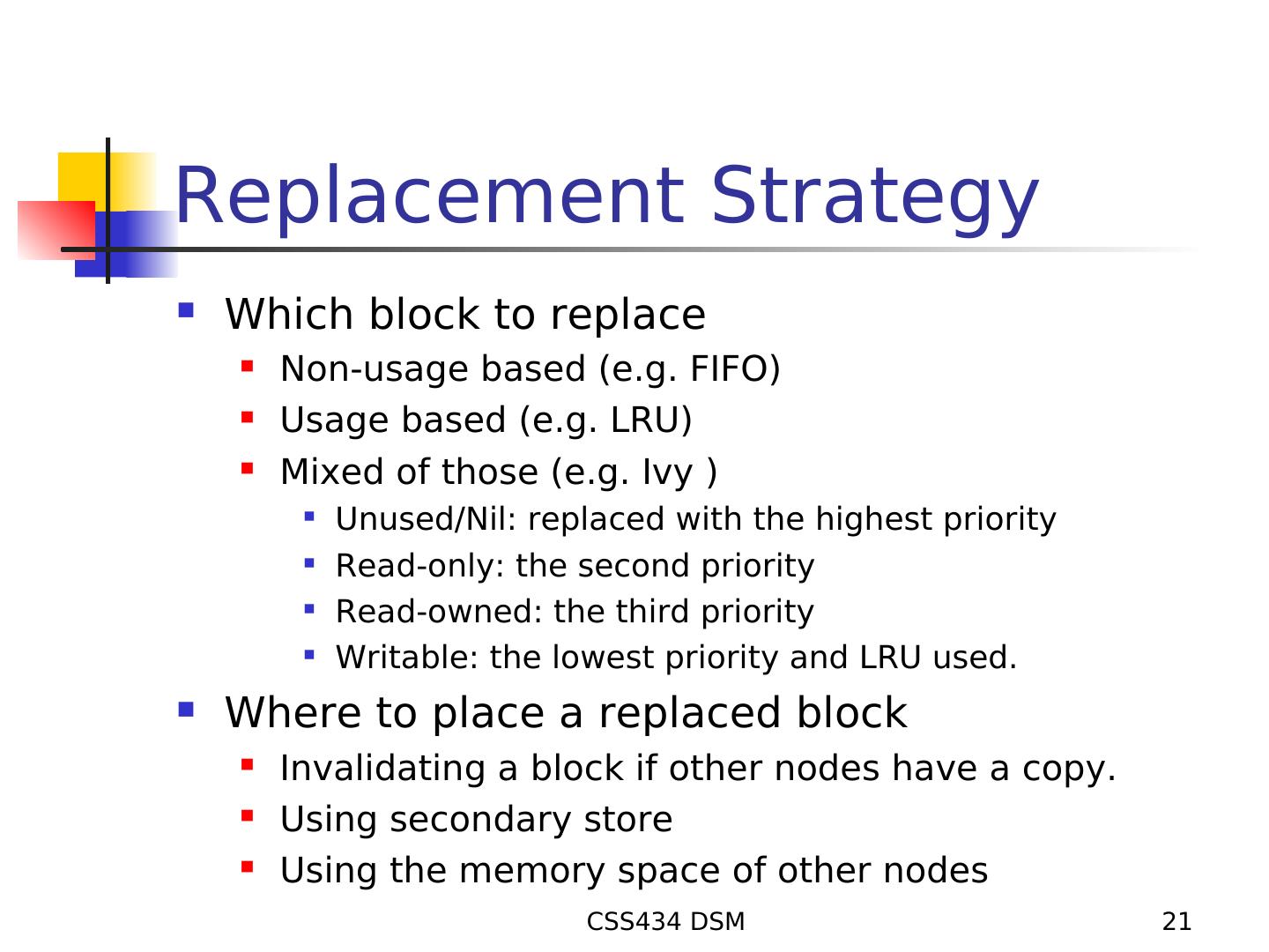 21 .Replacement Strategy Which block to replace Non-usage based (e.g. FIFO) Usage based (e.g. LRU) Mixed of those (e.g. Ivy ) Unused/Nil: replaced with the highest priority Read-only: the second priority Read-owned: the third priority Writable: the lowest priority and LRU used. Where to place a replaced block Invalidating a block if other nodes have a copy. Using secondary store Using the memory space of other nodes CSS434 DSM 21