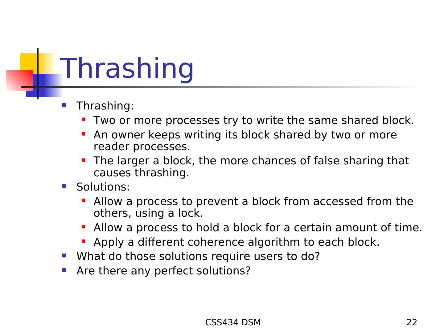 22 .Thrashing Thrashing: Two or more processes try to write the same shared block. An owner keeps writing its block shared by two or more reader processes. The larger a block, the more chances of false sharing that causes thrashing. Solutions: Allow a process to prevent a block from accessed from the others, using a lock. Allow a process to hold a block for a certain amount of time. Apply a different coherence algorithm to each block. What do those solutions require users to do? Are there any perfect solutions? CSS434 DSM 22
