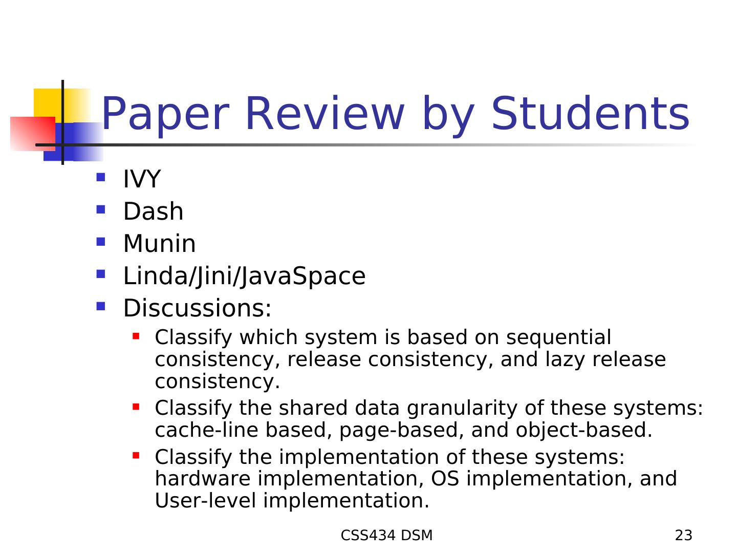 23 .Paper Review by Students IVY Dash Munin Linda/Jini/JavaSpace Discussions: Classify which system is based on sequential consistency, release consistency, and lazy release consistency. Classify the shared data granularity of these systems: cache-line based, page-based, and object-based. Classify the implementation of these systems: hardware implementation, OS implementation, and User-level implementation. CSS434 DSM 23