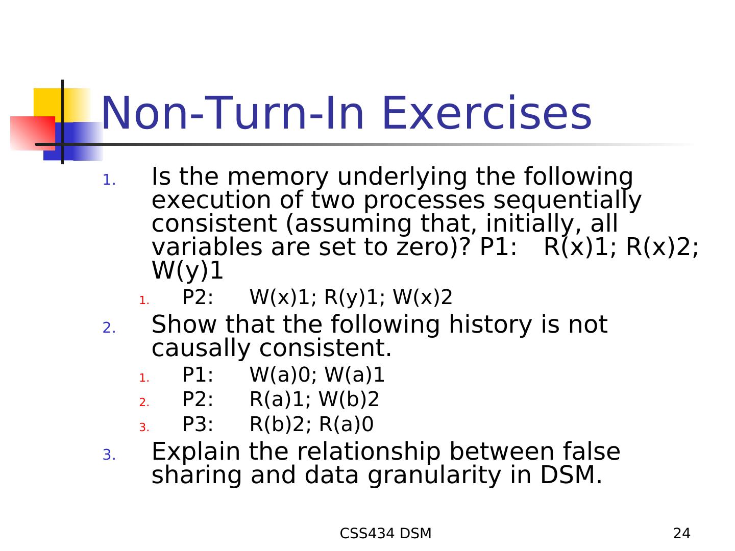 24 .Non-Turn-In Exercises 1. Is the memory underlying the following execution of two processes sequentially consistent (assuming that, initially, all variables are set to zero)? P1: R(x)1; R(x)2; W(y)1 1. P2: W(x)1; R(y)1; W(x)2 2. Show that the following history is not causally consistent. 1. P1: W(a)0; W(a)1 2. P2: R(a)1; W(b)2 3. P3: R(b)2; R(a)0 3. Explain the relationship between false sharing and data granularity in DSM. CSS434 DSM 24