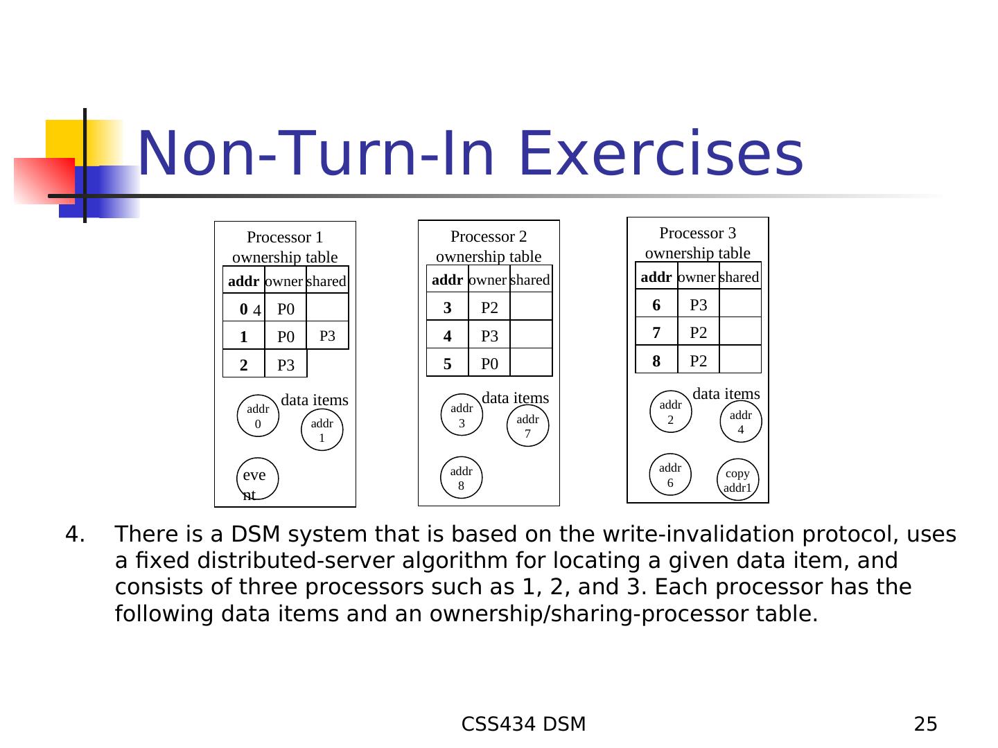 25 . Non-Turn-In Exercises Processor 1 Processor 2 Processor 3 ownership table ownership table ownership table addr owner shared addr owner shared addr owner shared 0 4 P0 3 P2 6 P3 1 P0 P3 4 P3 7 P2 2 P3 5 P0 8 P2 data items data items data items addr addr addr addr 2 addr 0 addr 3 7 4 1 addr addr eve 6 copy 8 addr1 nt 4. There is a DSM system that is based on the write-invalidation protocol, uses a fixed distributed-server algorithm for locating a given data item, and consists of three processors such as 1, 2, and 3. Each processor has the following data items and an ownership/sharing-processor table. CSS434 DSM 25
