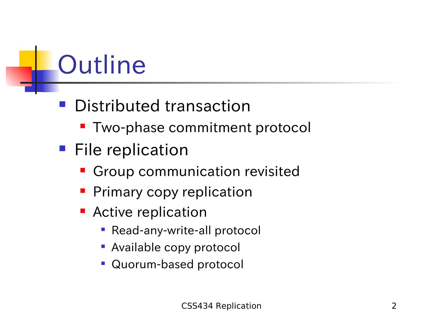 2 .Outline Distributed transaction Two-phase commitment protocol File replication Group communication revisited Primary copy replication Active replication Read-any-write-all protocol Available copy protocol Quorum-based protocol CSS434 Replication 2