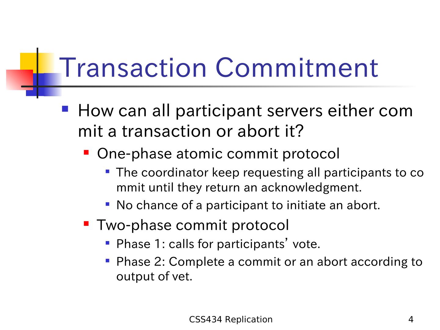 4 .Transaction Commitment How can all participant servers either com mit a transaction or abort it? One-phase atomic commit protocol The coordinator keep requesting all participants to co mmit until they return an acknowledgment. No chance of a participant to initiate an abort. Two-phase commit protocol Phase 1: calls for participants’ vote. Phase 2: Complete a commit or an abort according to output of vet. CSS434 Replication 4