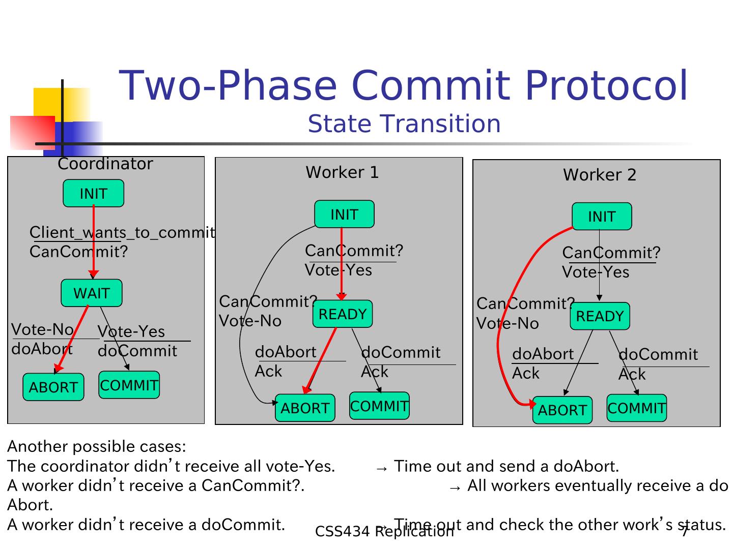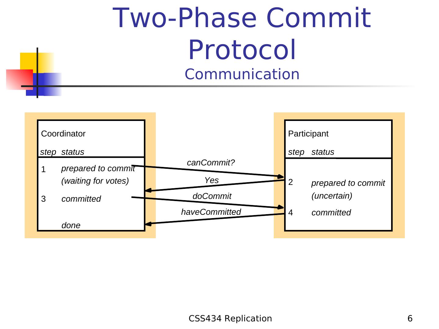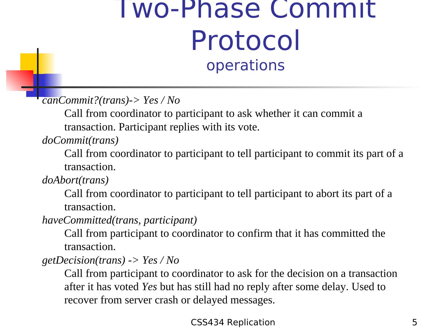 5 . Two-Phase Commit Protocol operations canCommit?(trans)-> Yes / No Call from coordinator to participant to ask whether it can commit a transaction. Participant replies with its vote. doCommit(trans) Call from coordinator to participant to tell participant to commit its part of a transaction. doAbort(trans) Call from coordinator to participant to tell participant to abort its part of a transaction. haveCommitted(trans, participant) Call from participant to coordinator to confirm that it has committed the transaction. getDecision(trans) -> Yes / No Call from participant to coordinator to ask for the decision on a transaction after it has voted Yes but has still had no reply after some delay. Used to recover from server crash or delayed messages. CSS434 Replication 5
