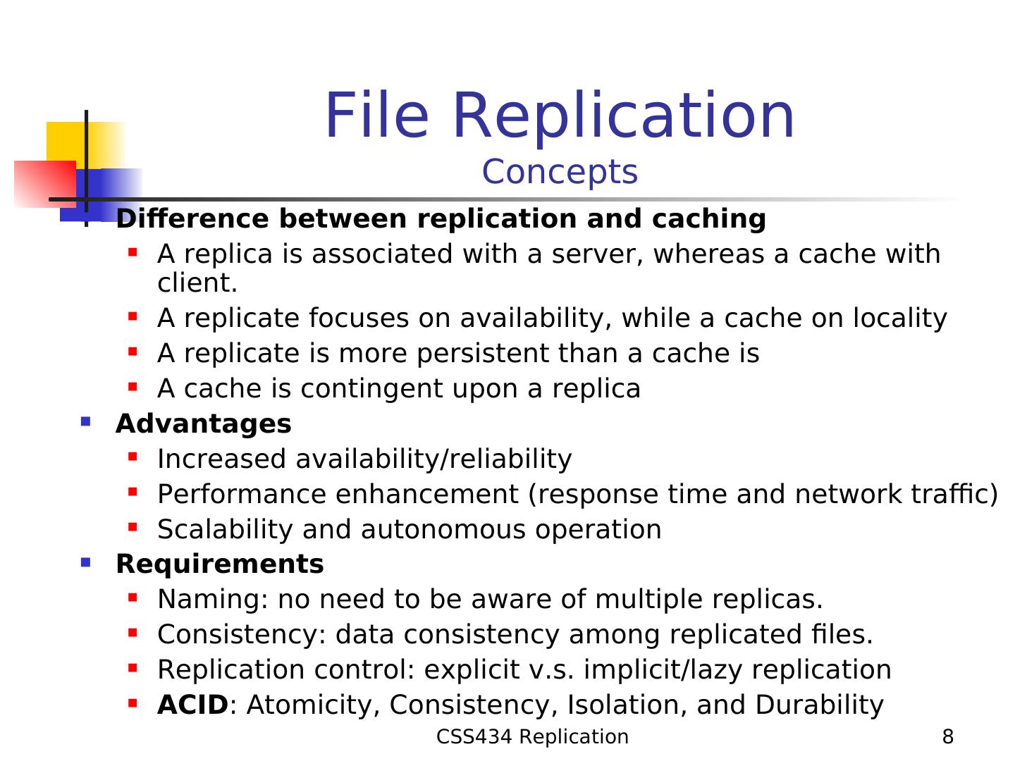 8 . File Replication Concepts Difference between replication and caching A replica is associated with a server, whereas a cache with client. A replicate focuses on availability, while a cache on locality A replicate is more persistent than a cache is A cache is contingent upon a replica Advantages Increased availability/reliability Performance enhancement (response time and network traffic) Scalability and autonomous operation Requirements Naming: no need to be aware of multiple replicas. Consistency: data consistency among replicated files. Replication control: explicit v.s. implicit/lazy replication ACID: Atomicity, Consistency, Isolation, and Durability CSS434 Replication 8