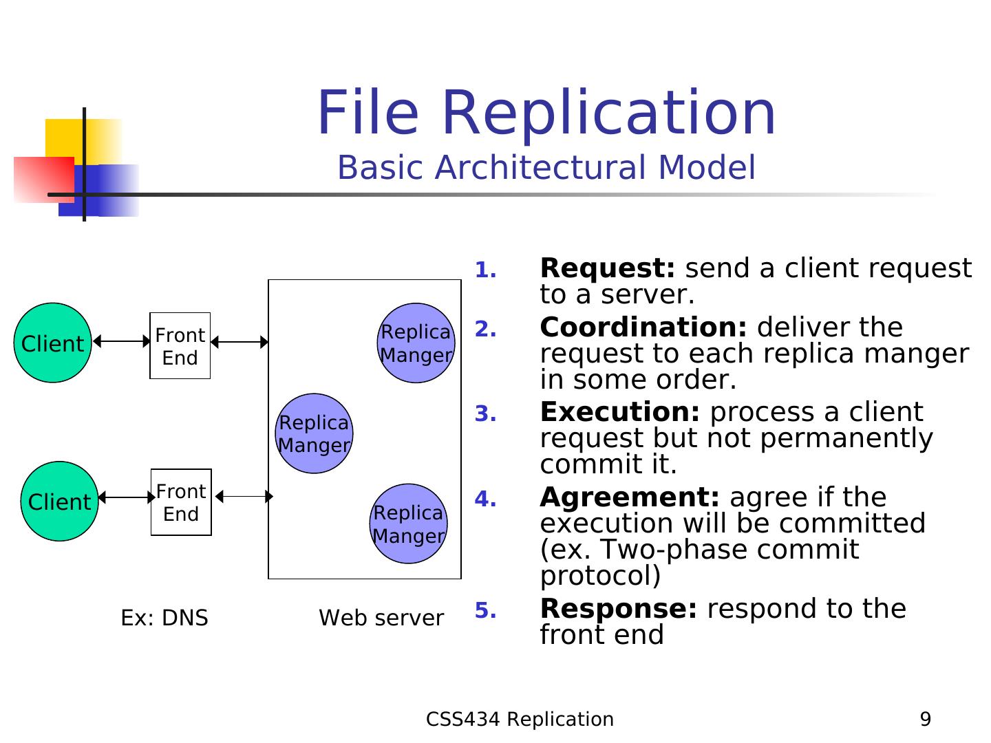 9 . File Replication Basic Architectural Model 1. Request: send a client request to a server. Front Replica 2. Coordination: deliver the Client End Manger request to each replica manger in some order. Replica 3. Execution: process a client Manger request but not permanently commit it. Front 4. Agreement: agree if the Client Replica End Manger execution will be committed (ex. Two-phase commit protocol) Ex: DNS Web server 5. Response: respond to the front end CSS434 Replication 9