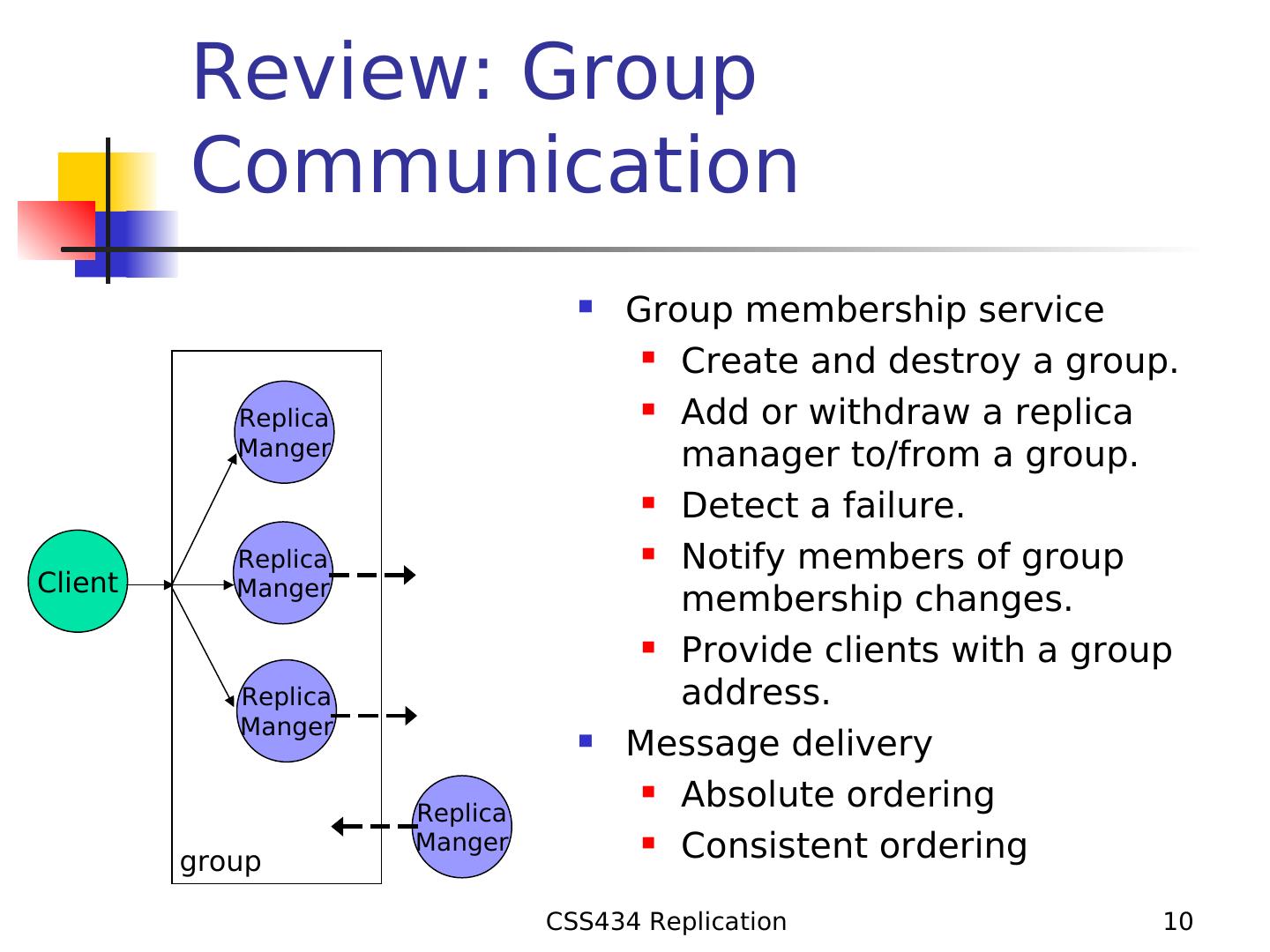 10 . Review: Group Communication Group membership service Create and destroy a group. Add or withdraw a replica Replica Manger manager to/from a group. Detect a failure. Replica Notify members of group Client Manger membership changes. Provide clients with a group Replica address. Manger Message delivery Absolute ordering Replica Manger Consistent ordering group CSS434 Replication 10