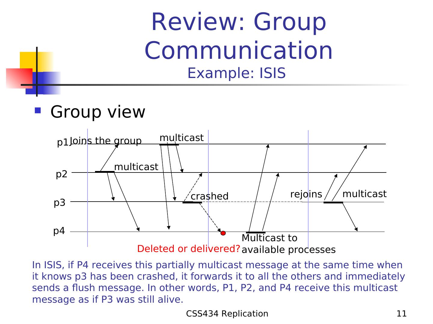 11 . Review: Group Communication Example: ISIS Group view p1 Joins the group multicast multicast p2 crashed rejoins multicast p3 p4 Multicast to Deleted or delivered? available processes In ISIS, if P4 receives this partially multicast message at the same time when it knows p3 has been crashed, it forwards it to all the others and immediately sends a flush message. In other words, P1, P2, and P4 receive this multicast message as if P3 was still alive. CSS434 Replication 11