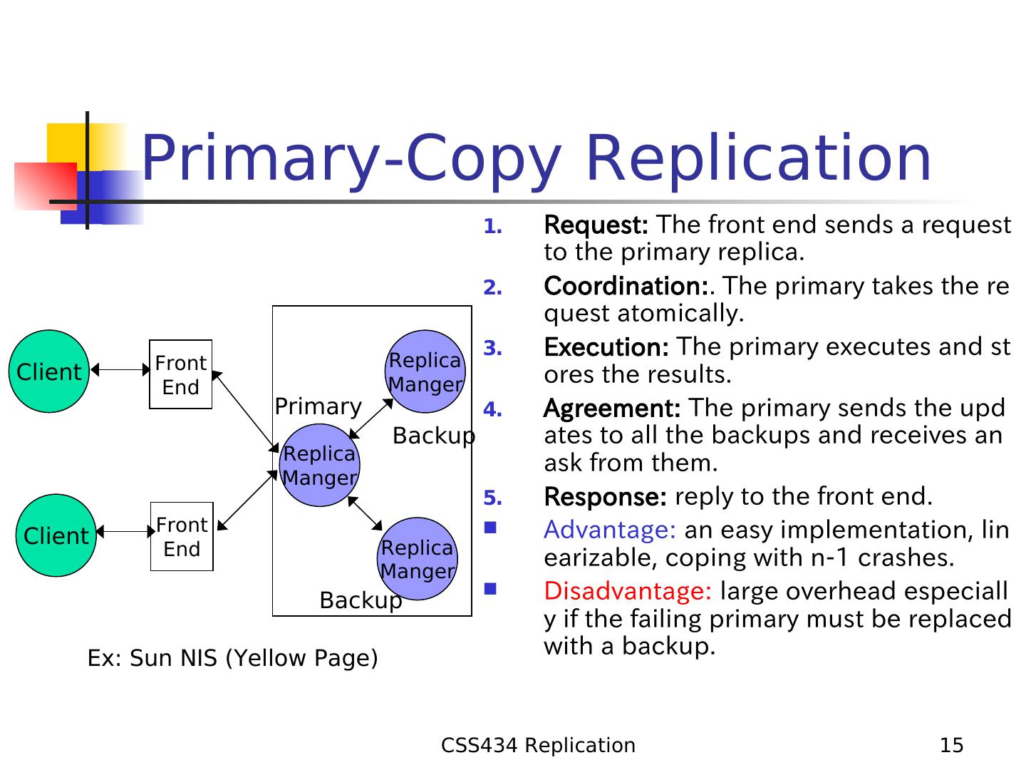 14 . Multi-copy Update Problem Keep in mind the basic architecture and group communication models, how can we update multiple copies over replica servers? Read-only replication Allow the replication of only immutable files. Primary backup replication Designate one copy as the primary copy and all the others as secondary copies. Active backup replication Access any or all of replicas Read-any-write-all protocol Available-copies protocol Quorum-based consensus CSS434 Replication 14