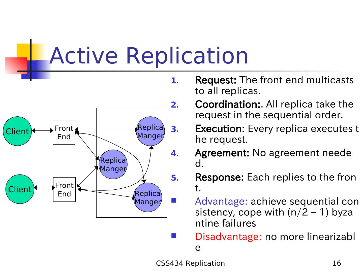 16 . Active Replication 1. Request: The front end multicasts to all replicas. 2. Coordination:. All replica take the request in the sequential order. Client Front Replica 3. Execution: Every replica executes t End Manger he request. 4. Agreement: No agreement neede Replica Manger d. 5. Response: Each replies to the fron Front t. Client Replica End Manger Advantage: achieve sequential con sistency, cope with (n/2 – 1) byza ntine failures Disadvantage: no more linearizabl e CSS434 Replication 16