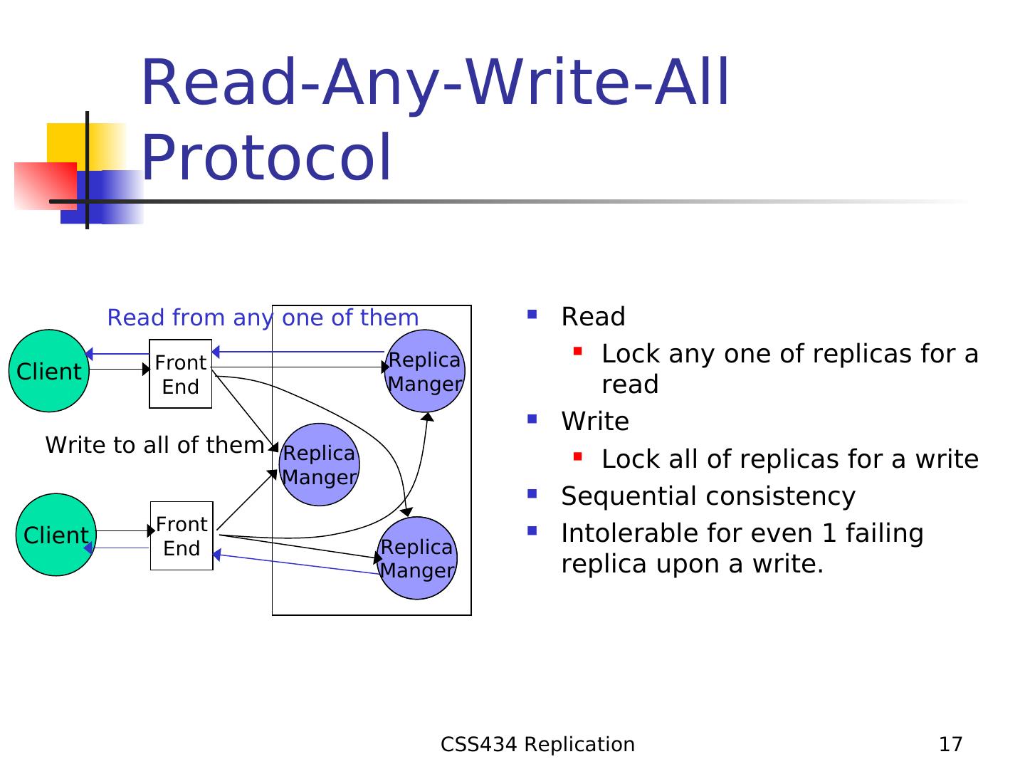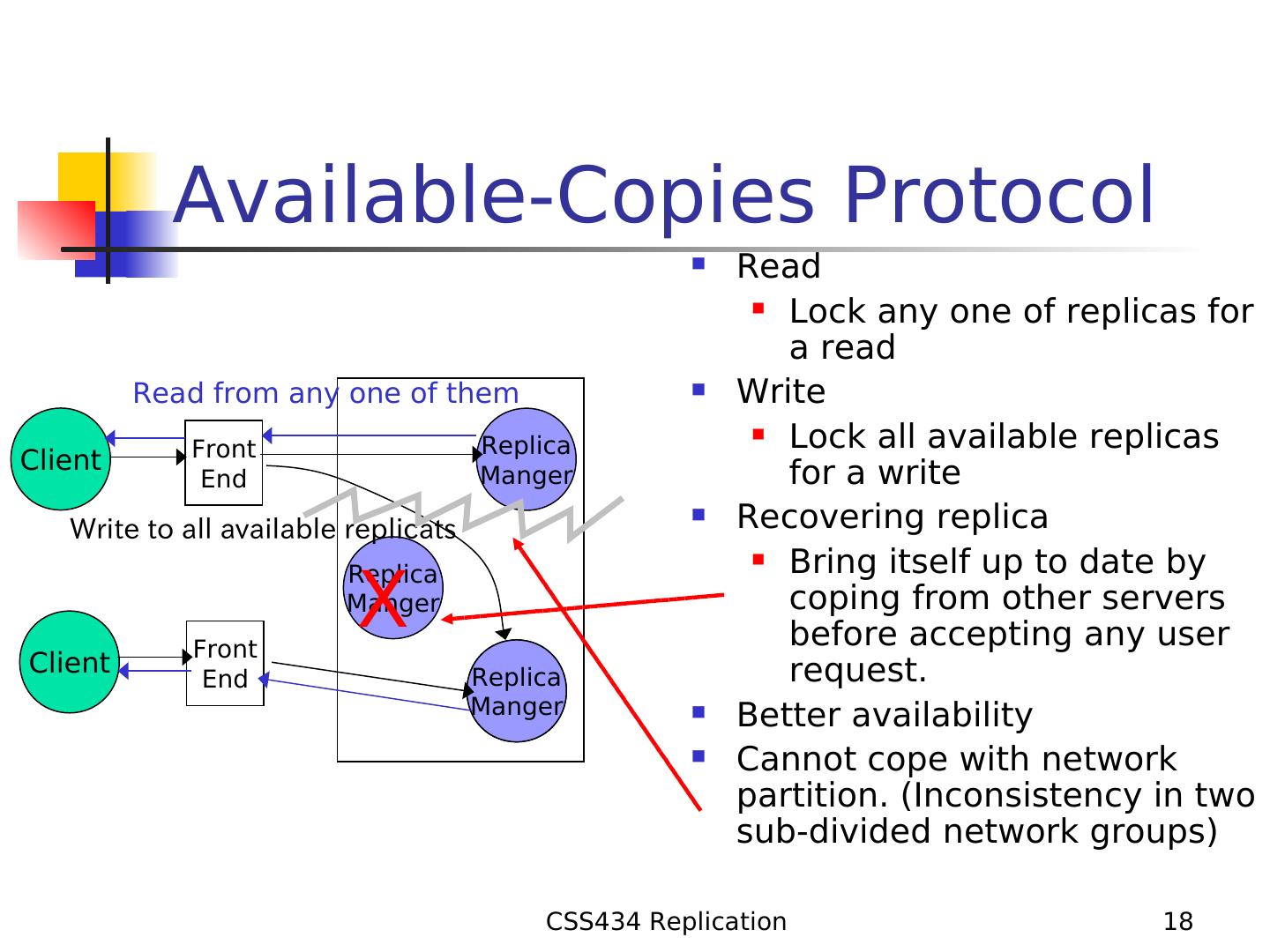 17 . Read-Any-Write-All Protocol Read from any one of them Read Lock any one of replicas for a Front Replica Client End Manger read Write Write to all of them Replica Lock all of replicas for a write Manger Sequential consistency Front Client Replica Intolerable for even 1 failing End Manger replica upon a write. CSS434 Replication 17