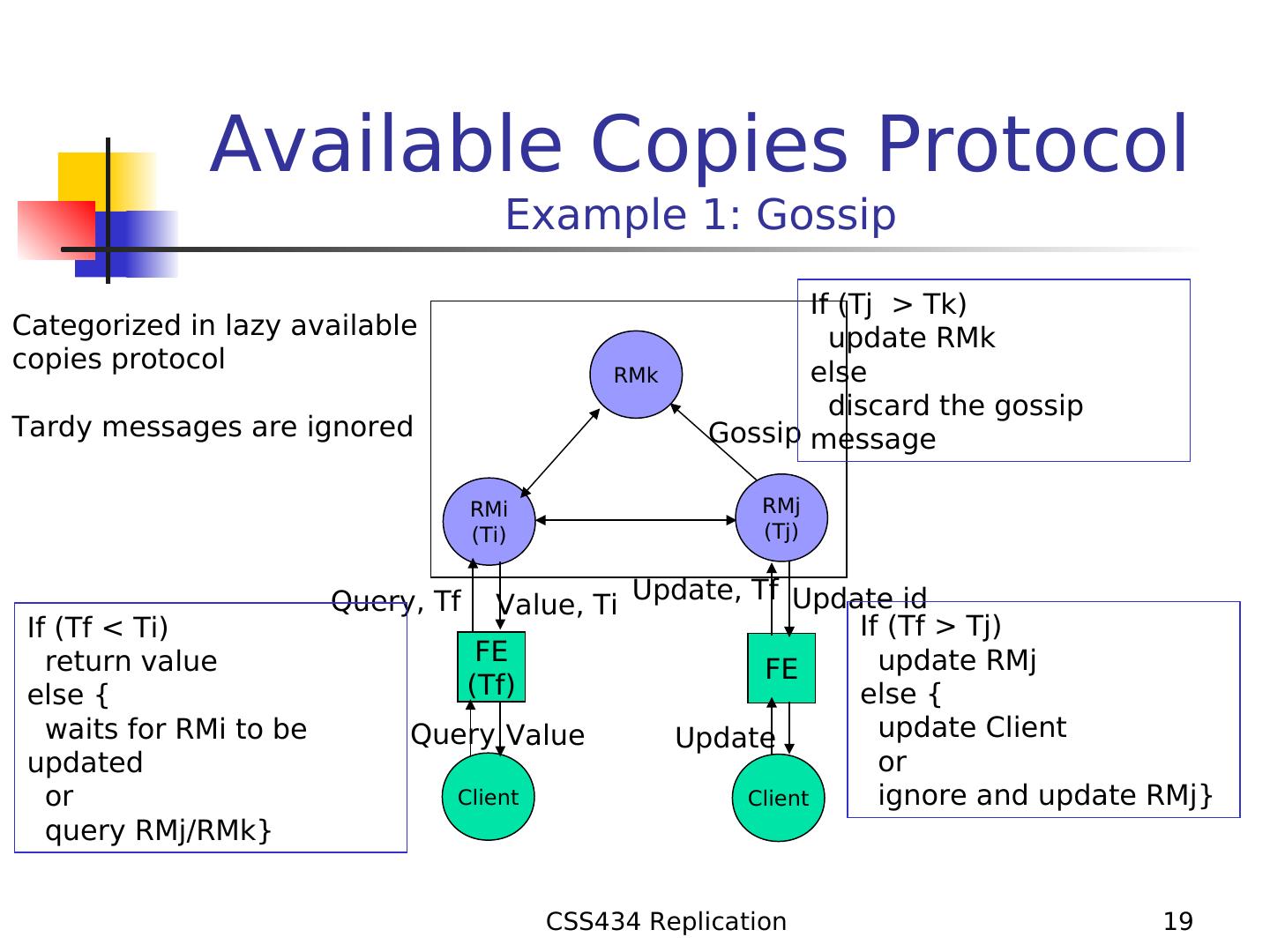 19 . Available Copies Protocol Example 1: Gossip If (Tj > Tk) Categorized in lazy available update RMk copies protocol else RMk discard the gossip Tardy messages are ignored Gossip message RMi RMj (Ti) (Tj) Query, Tf Update, Tf Update id Value, Ti If (Tf < Ti) If (Tf > Tj) return value FE update RMj FE else { (Tf) else { waits for RMi to be Query Value Update update Client updated or or Client Client ignore and update RMj} query RMj/RMk} CSS434 Replication 19