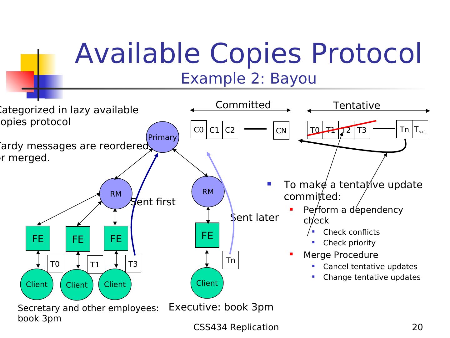 20 . Available Copies Protocol Example 2: Bayou Committed Tentative Categorized in lazy available copies protocol C0 C1 C2 CN T0 T1 T2 T3 Tn Tn+1 Primary Tardy messages are reordered or merged. To make a tentative update RM RM committed: Sent first Perform a dependency Sent later check Check conflicts FE FE FE FE Check priority Merge Procedure Tn T0 T1 T3 Cancel tentative updates Change tentative updates Client Client Client Client Secretary and other employees: Executive: book 3pm book 3pm CSS434 Replication 20