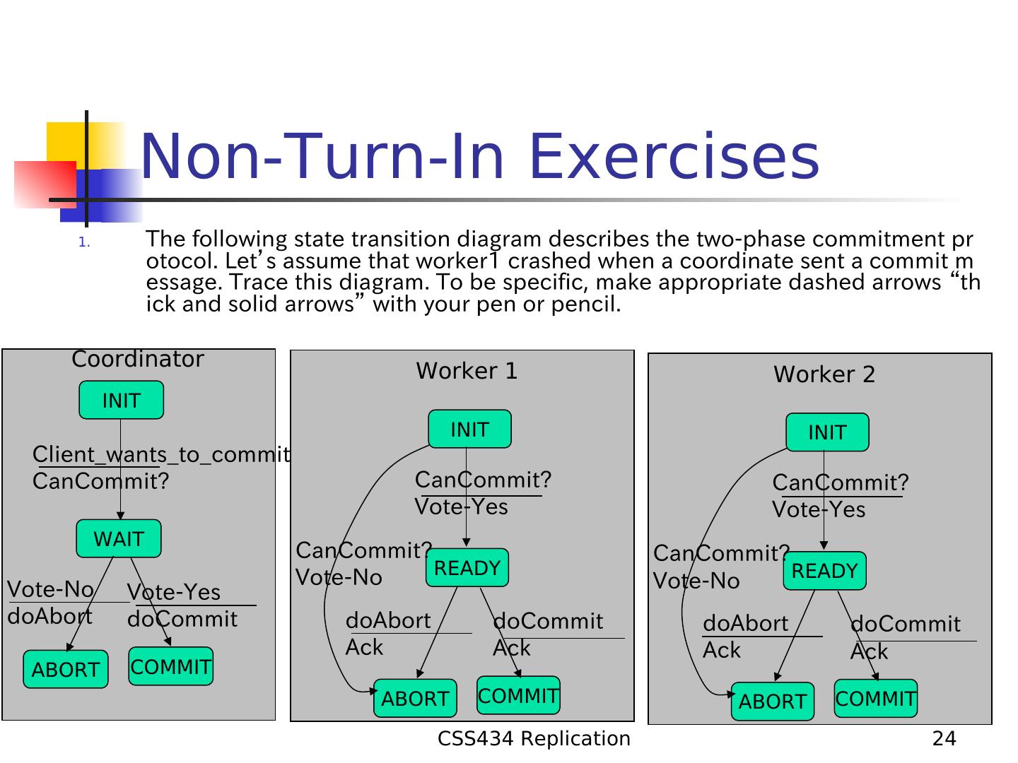 24 . Non-Turn-In Exercises 1. The following state transition diagram describes the two-phase commitment pr otocol. Let’s assume that worker1 crashed when a coordinate sent a commit m essage. Trace this diagram. To be specific, make appropriate dashed arrows “th ick and solid arrows” with your pen or pencil. Coordinator Worker 1 Worker 2 INIT INIT INIT Client_wants_to_commit CanCommit? CanCommit? CanCommit? Vote-Yes Vote-Yes WAIT CanCommit? CanCommit? READY READY Vote-No Vote-No Vote-No Vote-Yes doAbort doCommit doAbort doCommit doAbort doCommit Ack Ack Ack Ack ABORT COMMIT ABORT COMMIT ABORT COMMIT CSS434 Replication 24