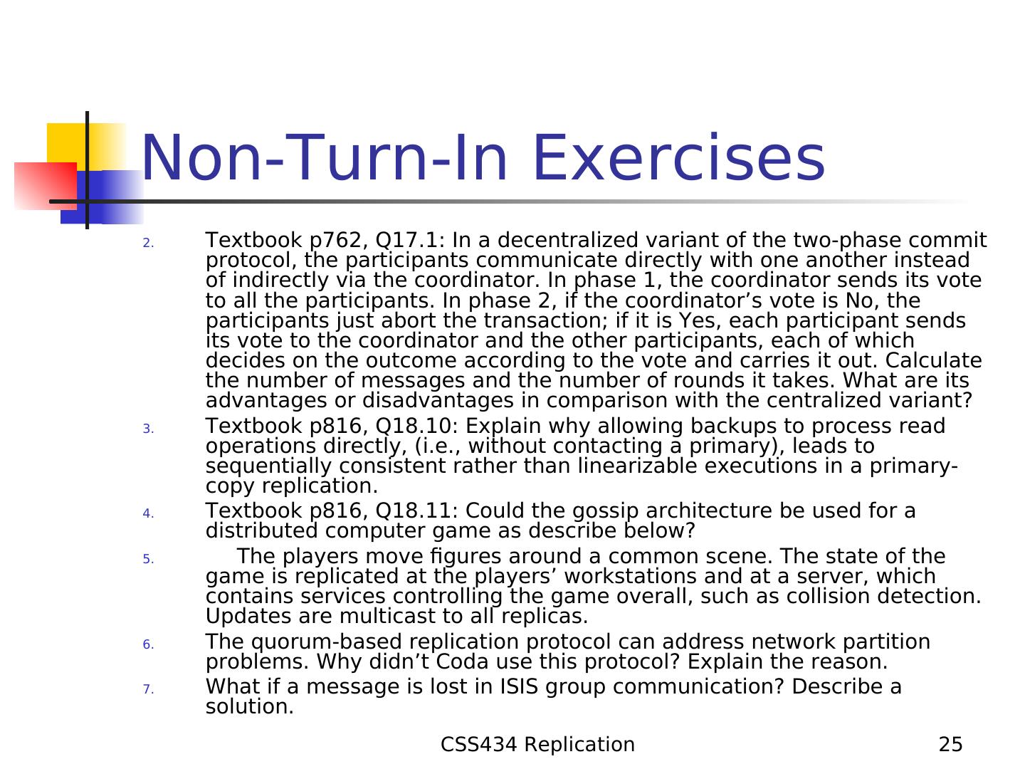 25 .Non-Turn-In Exercises 2. Textbook p762, Q17.1: In a decentralized variant of the two-phase commit protocol, the participants communicate directly with one another instead of indirectly via the coordinator. In phase 1, the coordinator sends its vote to all the participants. In phase 2, if the coordinator’s vote is No, the participants just abort the transaction; if it is Yes, each participant sends its vote to the coordinator and the other participants, each of which decides on the outcome according to the vote and carries it out. Calculate the number of messages and the number of rounds it takes. What are its advantages or disadvantages in comparison with the centralized variant? 3. Textbook p816, Q18.10: Explain why allowing backups to process read operations directly, (i.e., without contacting a primary), leads to sequentially consistent rather than linearizable executions in a primary- copy replication. 4. Textbook p816, Q18.11: Could the gossip architecture be used for a distributed computer game as describe below? 5. The players move figures around a common scene. The state of the game is replicated at the players’ workstations and at a server, which contains services controlling the game overall, such as collision detection. Updates are multicast to all replicas. 6. The quorum-based replication protocol can address network partition problems. Why didn’t Coda use this protocol? Explain the reason. 7. What if a message is lost in ISIS group communication? Describe a solution. CSS434 Replication 25