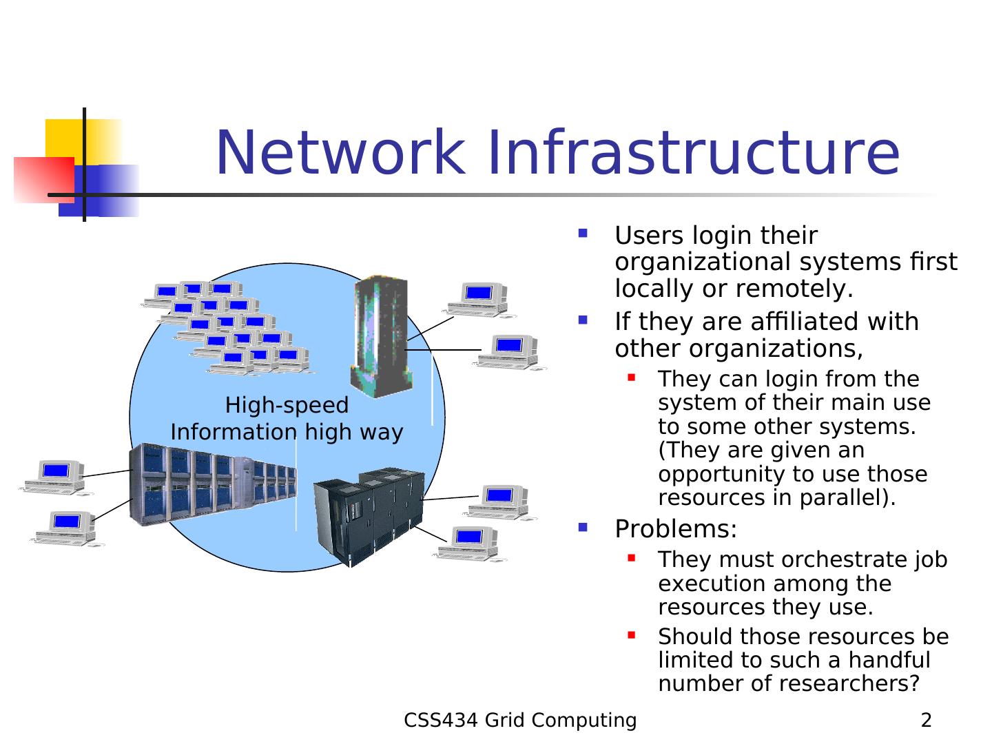 2 . Network Infrastructure Users login their organizational systems first locally or remotely. If they are affiliated with other organizations, They can login from the High-speed system of their main use Information high way to some other systems. (They are given an opportunity to use those resources in parallel). Problems: They must orchestrate job execution among the resources they use. Should those resources be limited to such a handful number of researchers? CSS434 Grid Computing 2