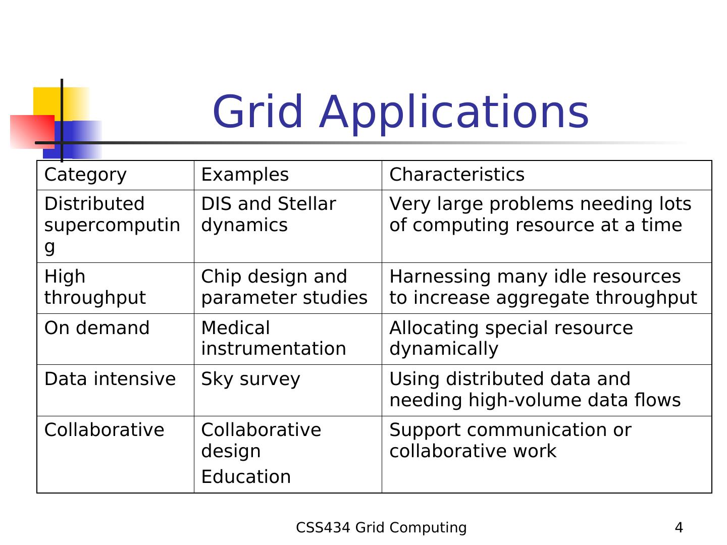 4 . Grid Applications Category Examples Characteristics Distributed DIS and Stellar Very large problems needing lots supercomputin dynamics of computing resource at a time g High Chip design and Harnessing many idle resources throughput parameter studies to increase aggregate throughput On demand Medical Allocating special resource instrumentation dynamically Data intensive Sky survey Using distributed data and needing high-volume data flows Collaborative Collaborative Support communication or design collaborative work Education CSS434 Grid Computing 4