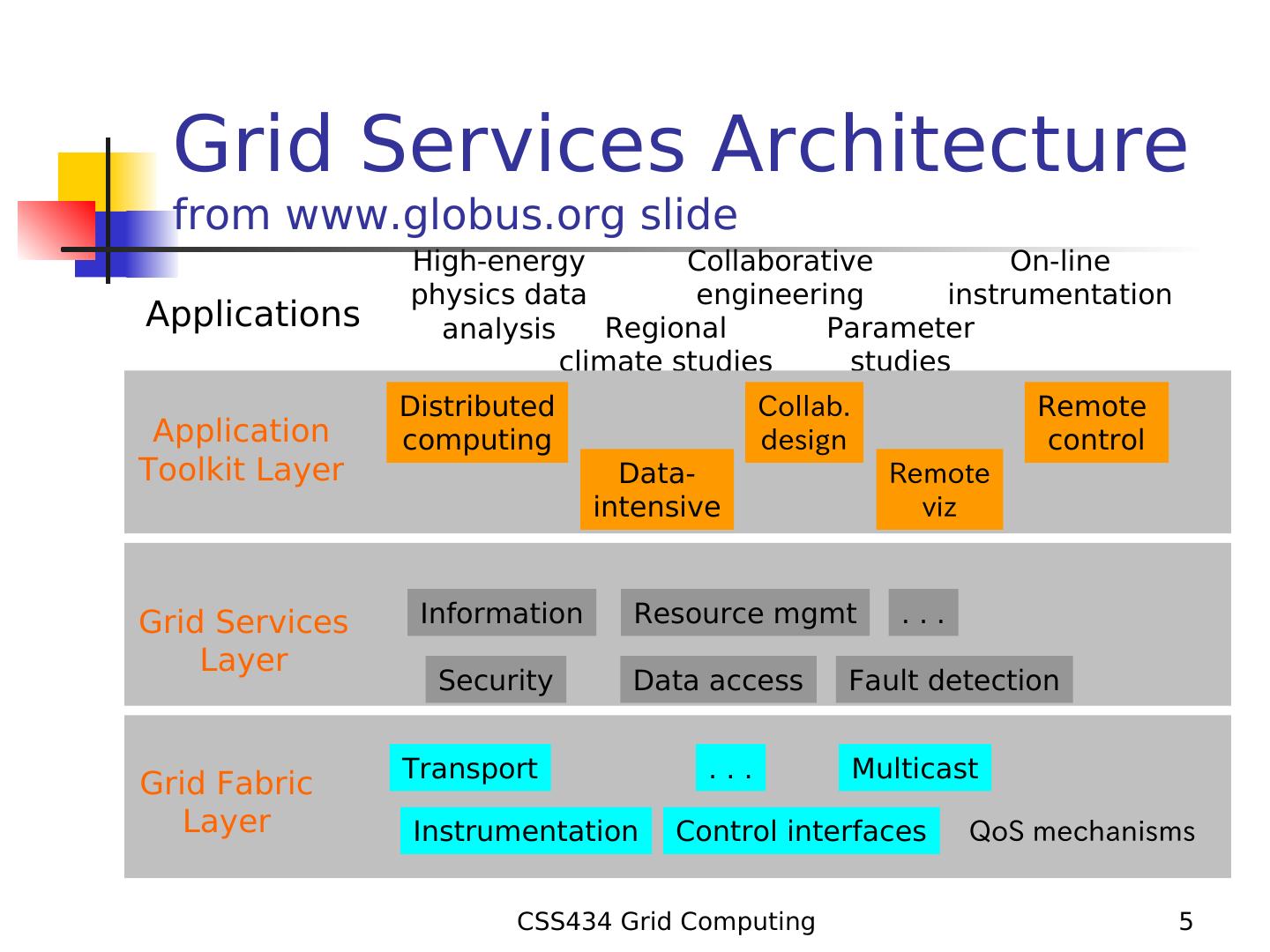 5 . Grid Services Architecture from www.globus.org slide High-energy Collaborative On-line physics data engineering instrumentation Applications analysis Regional Parameter climate studies studies Distributed Collab. Remote Application computing design control Toolkit Layer Data- Remote intensive viz Grid Services Information Resource mgmt ... Layer Security Data access Fault detection Transport ... Multicast Grid Fabric Layer Instrumentation Control interfaces QoS mechanisms CSS434 Grid Computing 5