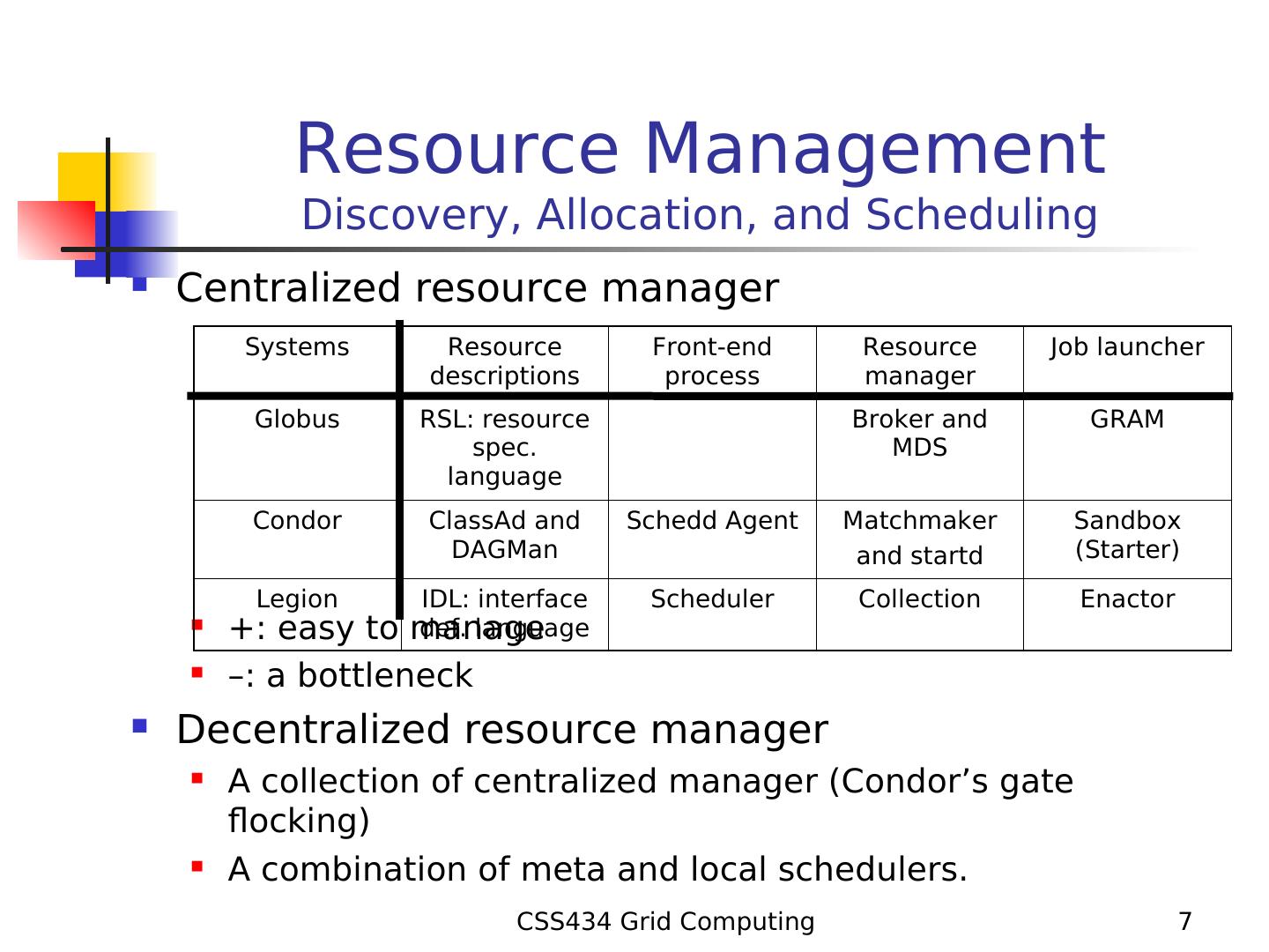 6 . Programming Model Uniform Access Paradigm Bag of task or master workers (Condor-MW) Client server (NetSolve) Object oriented (Legion) Synchronous applications (Not suited for massively parallel computation.) Language Support MPI-G – message passing (Globus) Open MP – shared memory Math Library – remote procedure (NetSolve) CSS434 Grid Computing 6