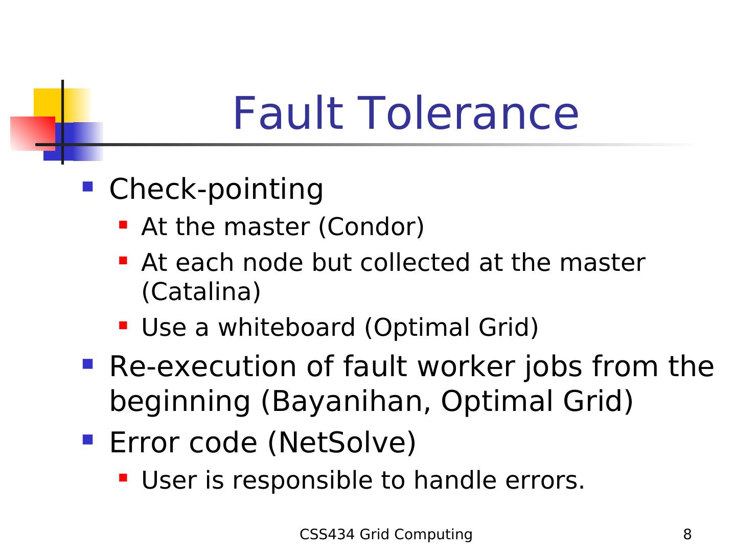 8 . Fault Tolerance Check-pointing At the master (Condor) At each node but collected at the master (Catalina) Use a whiteboard (Optimal Grid) Re-execution of fault worker jobs from the beginning (Bayanihan, Optimal Grid) Error code (NetSolve) User is responsible to handle errors. CSS434 Grid Computing 8
