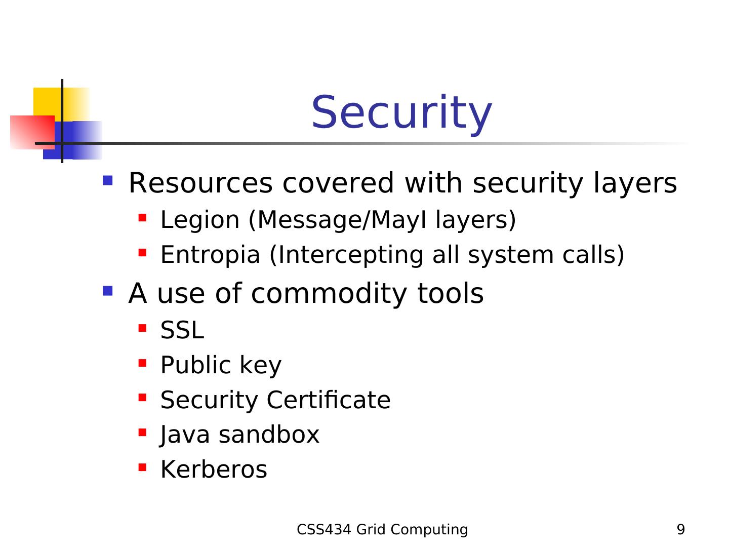 9 . Security Resources covered with security layers Legion (Message/MayI layers) Entropia (Intercepting all system calls) A use of commodity tools SSL Public key Security Certificate Java sandbox Kerberos CSS434 Grid Computing 9